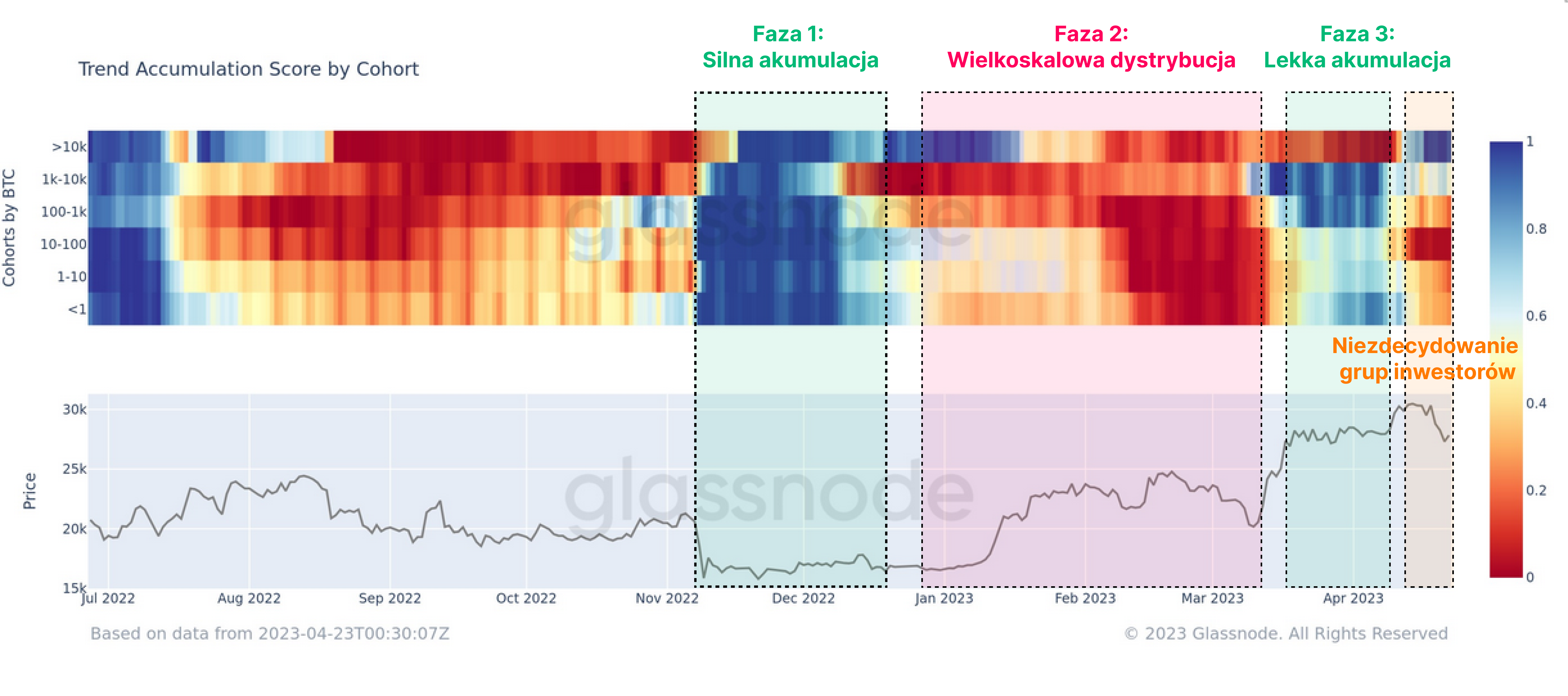- Faza 3: Lekka akumulacja podczas wzrostów na poziom 28 000$, gdy momentum rynkowe wzrosło, a ceny w końcu przekroczyły poziom 30 000$.