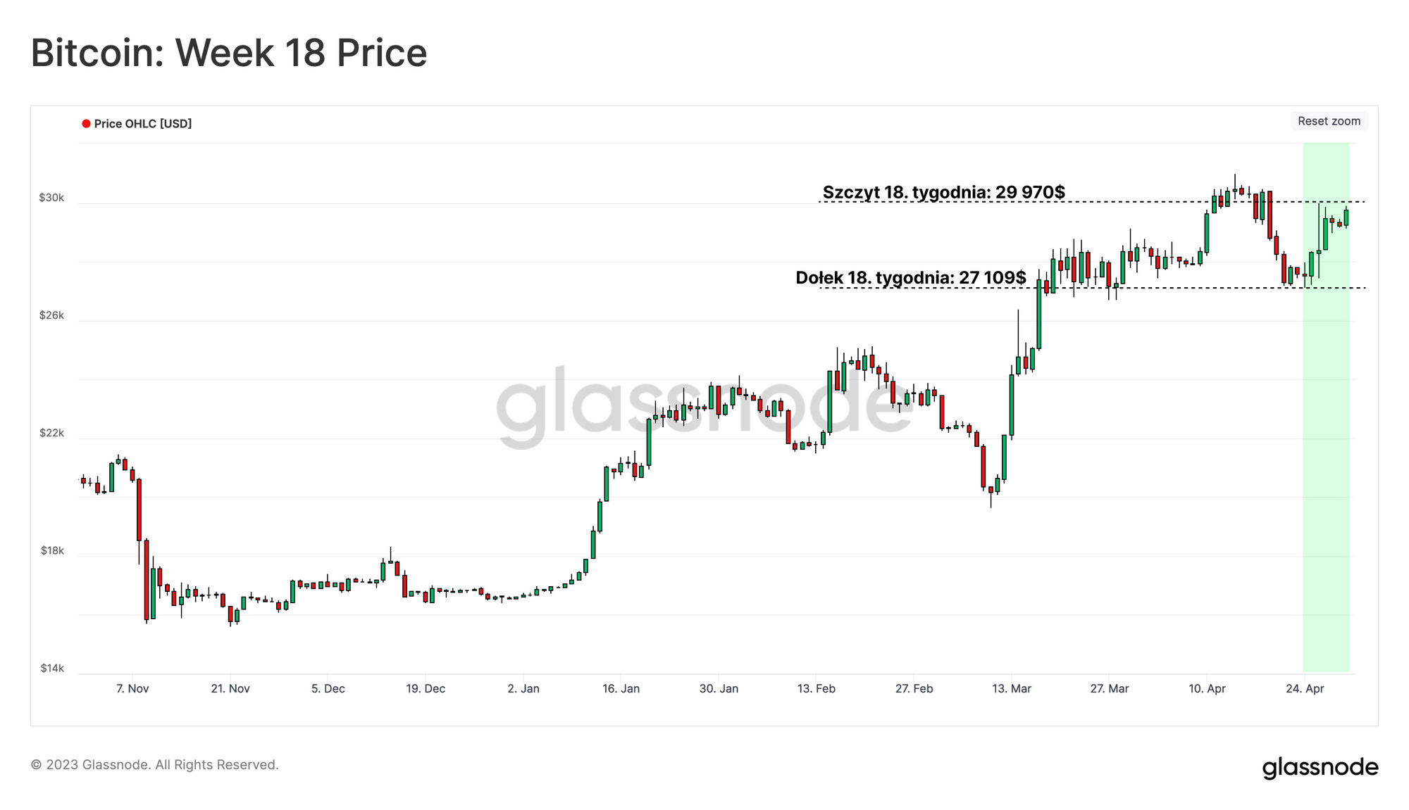 Od połowy marca na rynku Bitcoina testowane są zarówno wysokie/jak i niskie pasma w przedziale od 27 do 30 tysięcy dolarów, wzrastając w tym tygodniu od 27,1 do 29,9 tysięcy dolarów. Podczas tego wzrostu pojawiły się nieprawdziwe plotki o ruchach w portfelach Mt Gox i rządu USA. Widzieliśmy również aktywność posiadaczy starszych zasobów (>7 lat), co spowodowało powstanie słynnej świecy Doji w warunkach niskiej płynności, z cieniami w wysokości 1,5 tysiąca dolarów. Ten raport ma na celu omówienie wydarzeń, o których wspomniano powyżej, które spowodowały zmienność, a następnie przeanalizowanie strony popytu, poprzez podkreślenie wagi inwestorów krótkoterminowych w stosunku do działania cenowego w panującym trendzie wzrostowym.