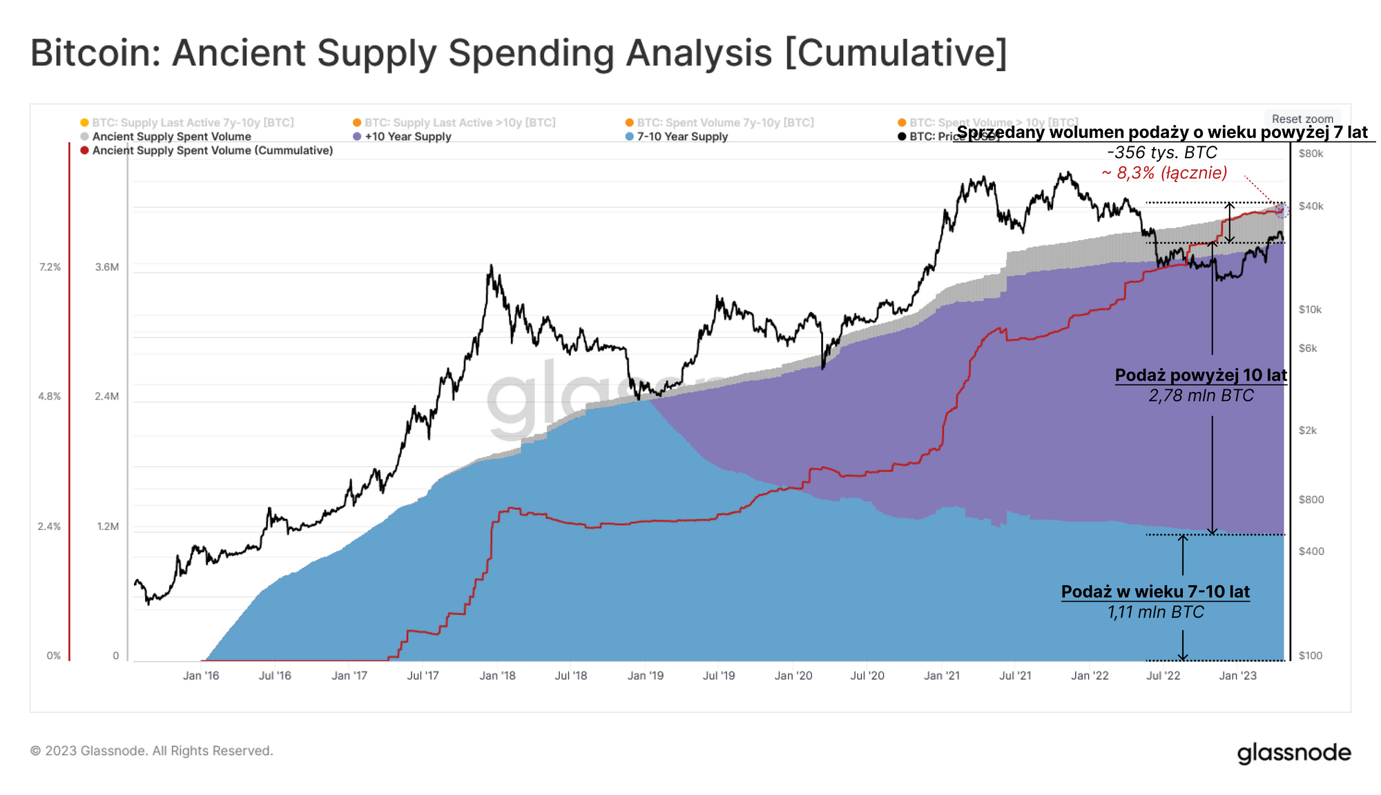 Rzucając okiem na sprzedaż "starożytnej" podaży, możemy zobaczyć, że od początku istnienia Bitcoina tylko 4,25 mln coinów osiągnęło status starożytnej podaży (7+ lat). Niesamowite jest to, że tylko 356 tys. z tych starożytnych coinów zostało kiedykolwiek sprzedanych, co stanowi 8,3% całkowitej podaży. Pozostałe 3,9 mln (20% krążącej podaży) pozostaje nieaktywne, często uważane za zagubione.