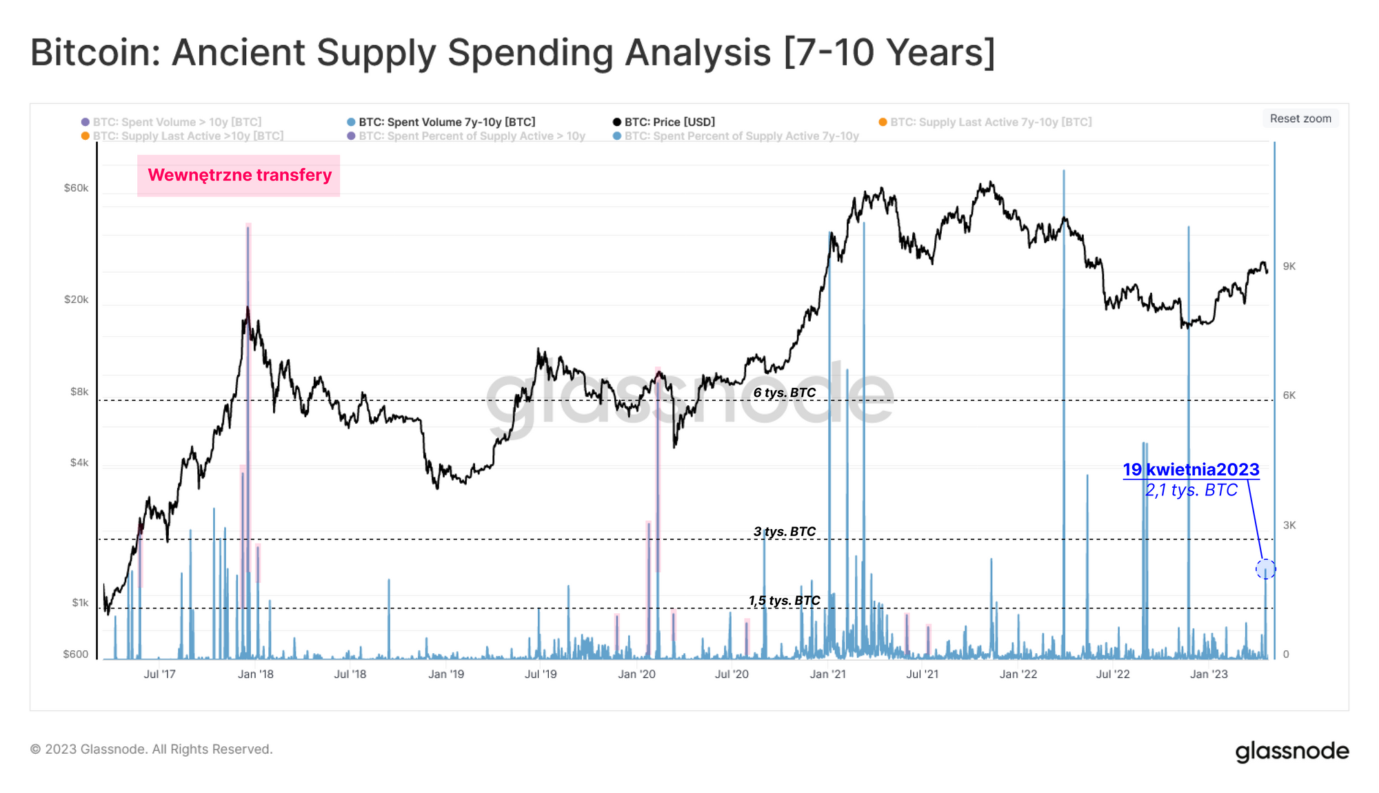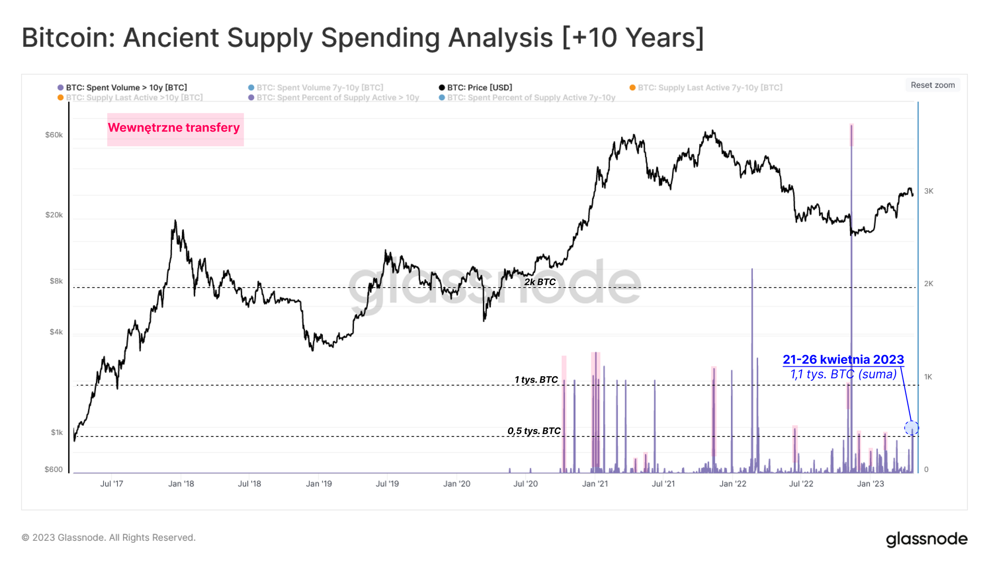 Analizując wolumen sprzedanej podaży z przedziałów wiekowych 7-10 lat oraz powyżej 10 lat, zauważamy, że w tym tygodniu zostało wybudzonych około 3,2 tysiąca BTC, z czego 1,1 tysiąca BTC zostało pierwotnie nabyte przed rokiem 2013. Po odfiltrowaniu wewnętrznych przelewów za pomocą korekty podmiotów 🟥, możemy potwierdzić, że te transfery nie były wewnętrzne. Jednak ich magnituda nie była względnie istotna w porównaniu z poprzednimi izolowanymi wydarzeniami podczas punktów zwrotnych cyklu.