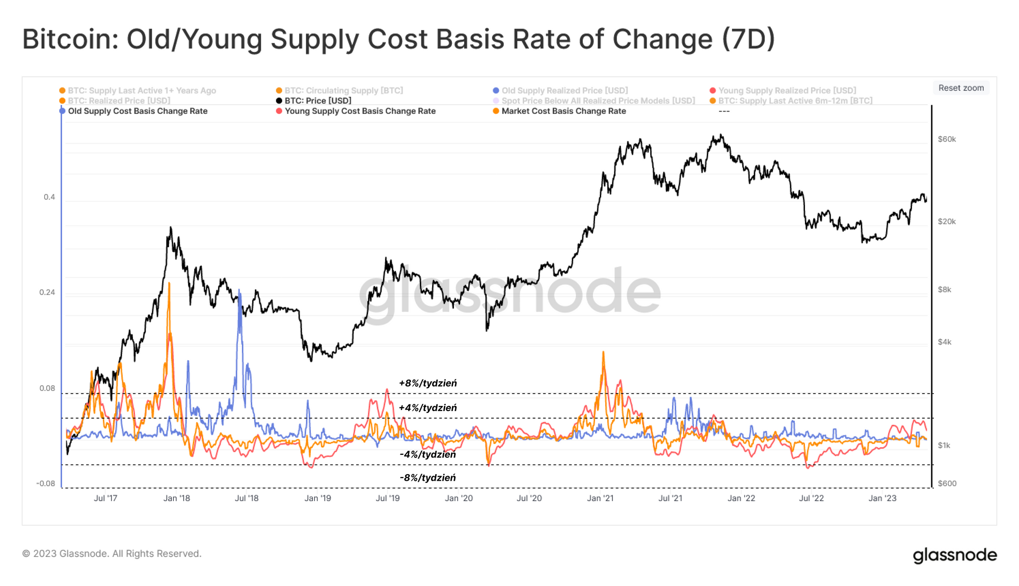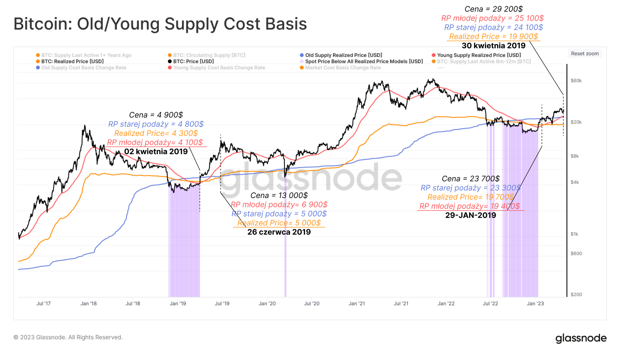 Przypomnieliśmy także koncepcję redystrybucji Starego/Młodego kapitału podczas cykli wzrostowych i wykorzystaliśmy ją do oceny popytu na rynku. Poprzez ocenę różnych kosztów bazowych dla poszczególnych grup inwestorów, pokazaliśmy, jak nowi inwestorzy wpływają na rynek, głównie poprzez swój niezrealizowany i zrealizowany zysk.