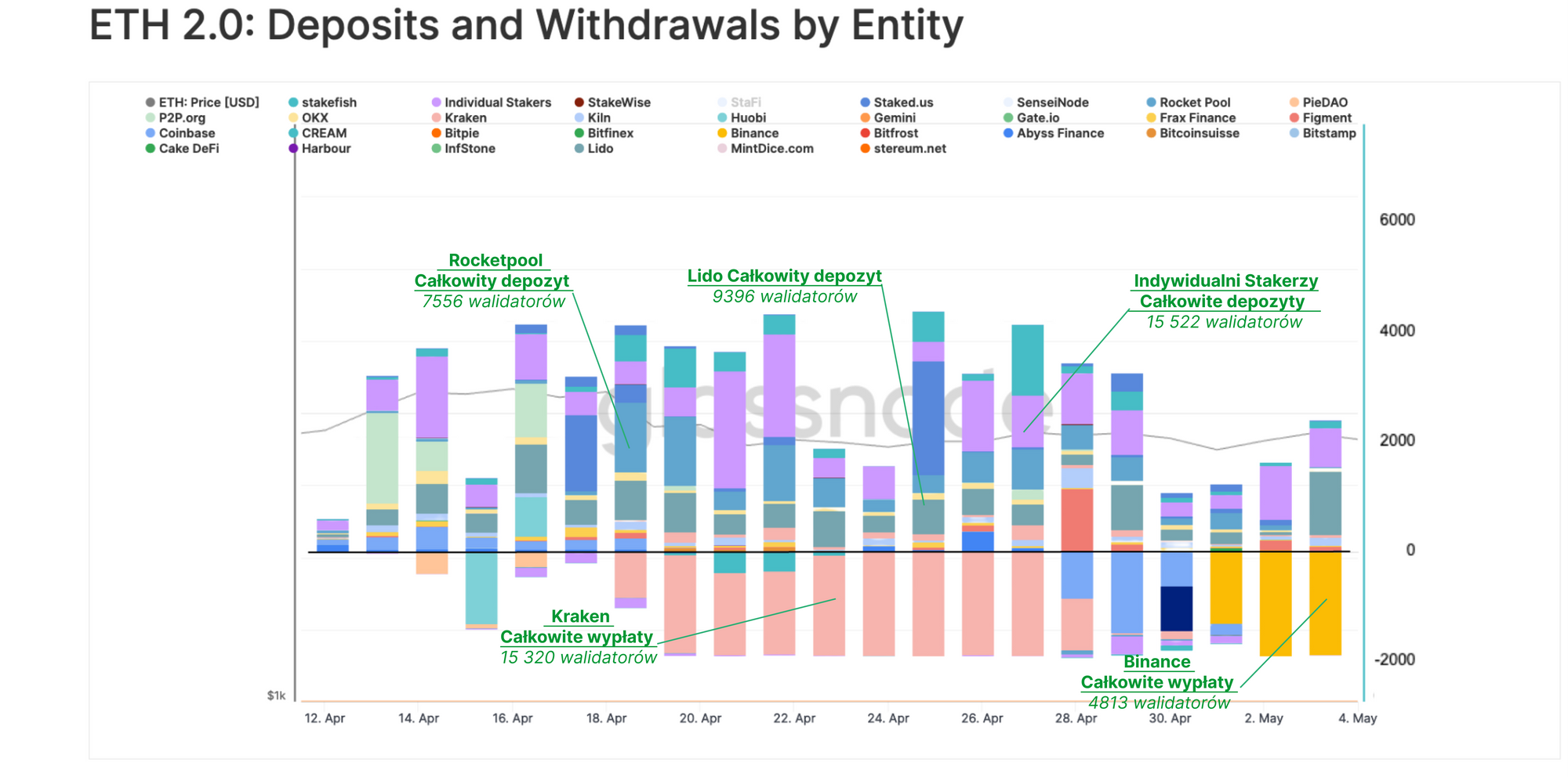 Sam Kraken odpowiada za wypłatę ekwiwalentu 15 501 walidatorów, co stanowi 496 000 z łącznie wycofanych 1,55 miliona ETH (32%). Binance zajmuje drugie miejsce z 6 000 dezaktywowanymi walidatorami, Coinbase z 5 179, Figment z 2 514, a Gate.io z 1 000 walidatorów. Pozostałe giełdy miały mniej niż 1 000 wypłat. Należy zauważyć, że Lido jeszcze nie włączył możliwości wypłat.