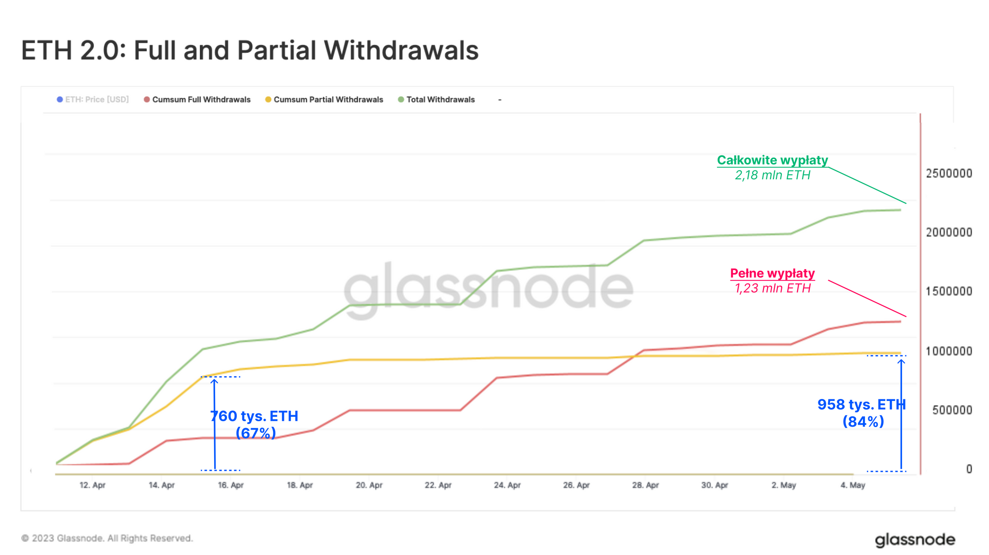 Po aktualizacji popyt na wyjście natychmiast osiągnął maksimum, a staking do wypłat ograniczono do 57 600 ETH. Od 28 kwietnia łączna suma wycofanego stakingu przewyższała wypłacone nagrody. Jest to interesujący rozwój sytuacji, ponieważ wiele analiz skupiało się głównie na nagrodach jako głównym źródle presji sprzedażowej ETH, jednak pełne wypłaty przewyższały częściowe pod względem odstakowanego wolumenu.
