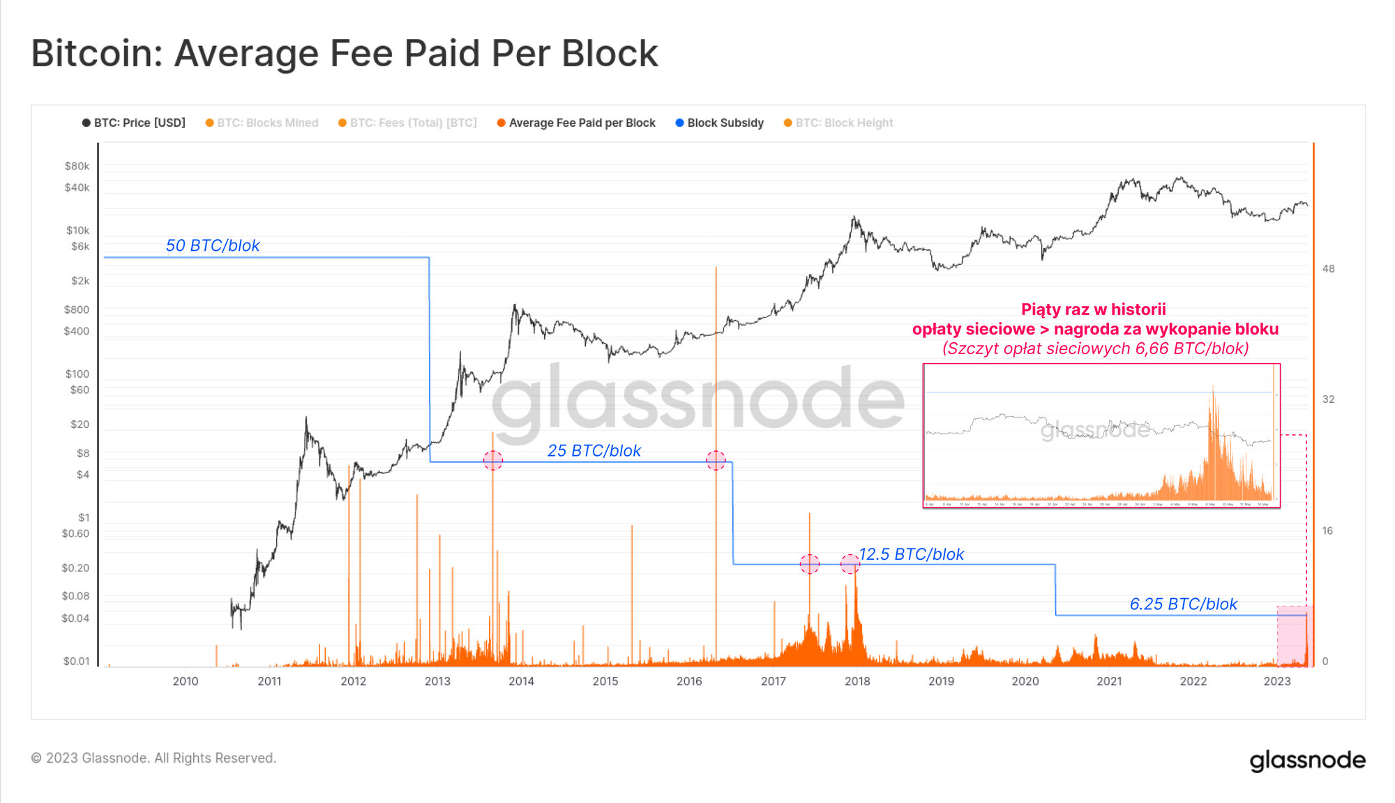 Na szczycie szału BRC-20, wydobywany blok płacił średnio 6,66 BTC w opłatach, co dawało łączną nagrodę w wysokości 12,9 BTC za blok (~348 000 USD).