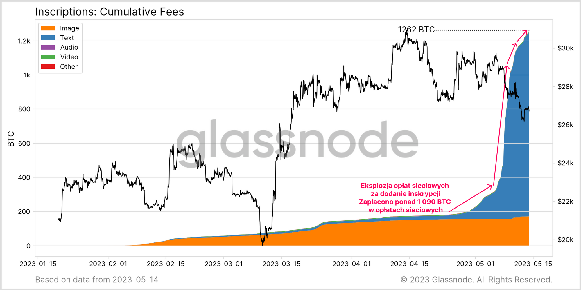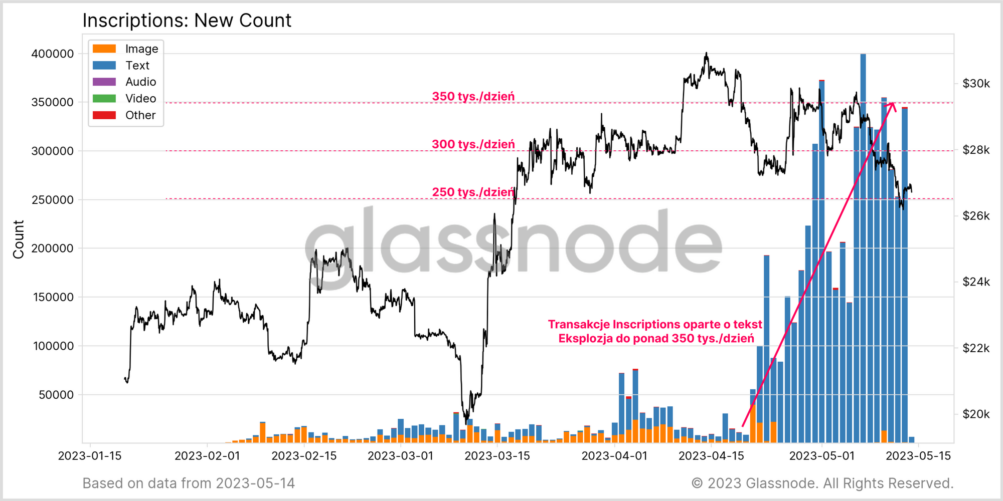Eksplozja inskrypcji tekstowych zostawiła pierwszą falę obrazów i plików w tyle. W kilku przypadkach w ciągu maja na blockchainie kodowano ponad 350 tysięcy inskrypcji tekstowych w ciągu jednego dnia, utrzymując poziomy znacznie powyżej 250 tysięcy na dzień przez ostatni tydzień.