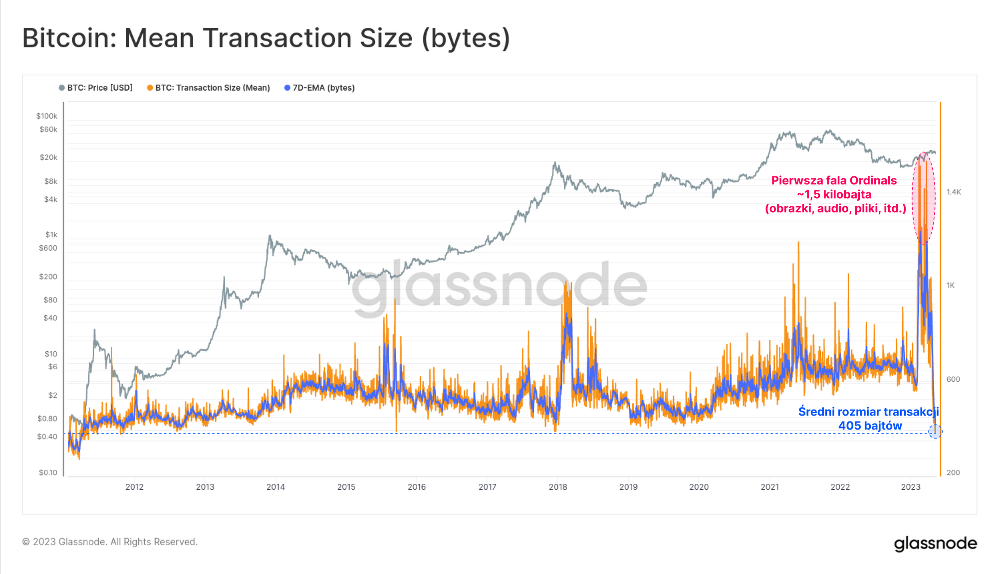 Ponieważ inskrypcje BRC-20 to jedynie niewielkie pliki tekstowe JSON i korzystają z 75% zniżki SegWit na dane poświadczające, ich ślad danych na łańcuchu jest stosunkowo mały. W rezultacie średni rozmiar transakcji (w bajtach) skurczył się do 405 bajtów, co jest prawie najniższym poziomem w historii.