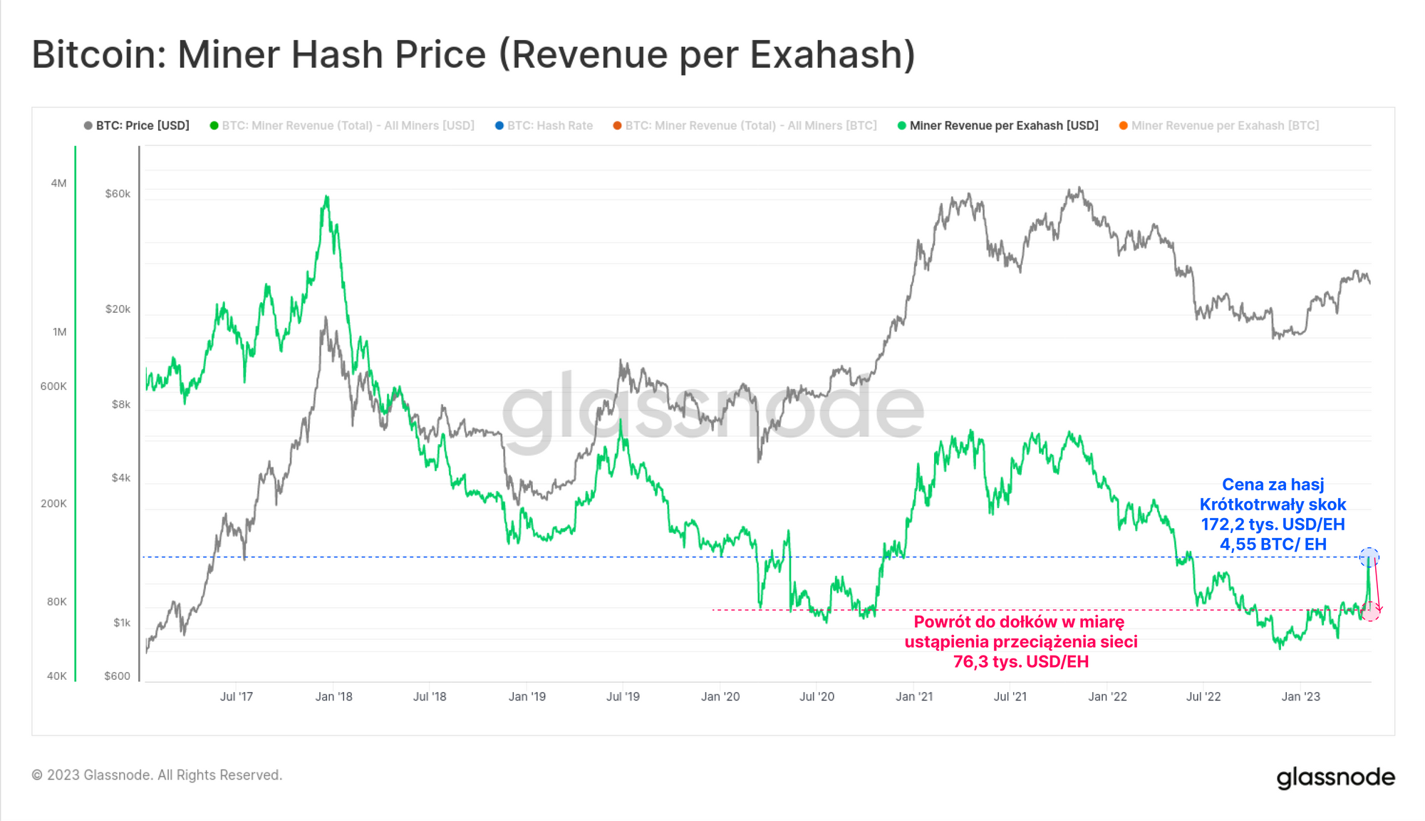 Ceną za hash krótkotrwało wzrosła w tym tygodniu do 172 200$/EH, jednak od tego czasu spadła o 55% do 76 300$/EH, wraz z ustępowaniem presji opłatowej. Choć ten skok popytu na przestrzeń blokową przyniósł pozytywny wzrost przychodów górników, jest to jak dotąd krótkotrwałe i blaknie w porównaniu do nieustającego spadku (w skali logarytmicznej) ceny za hash.
