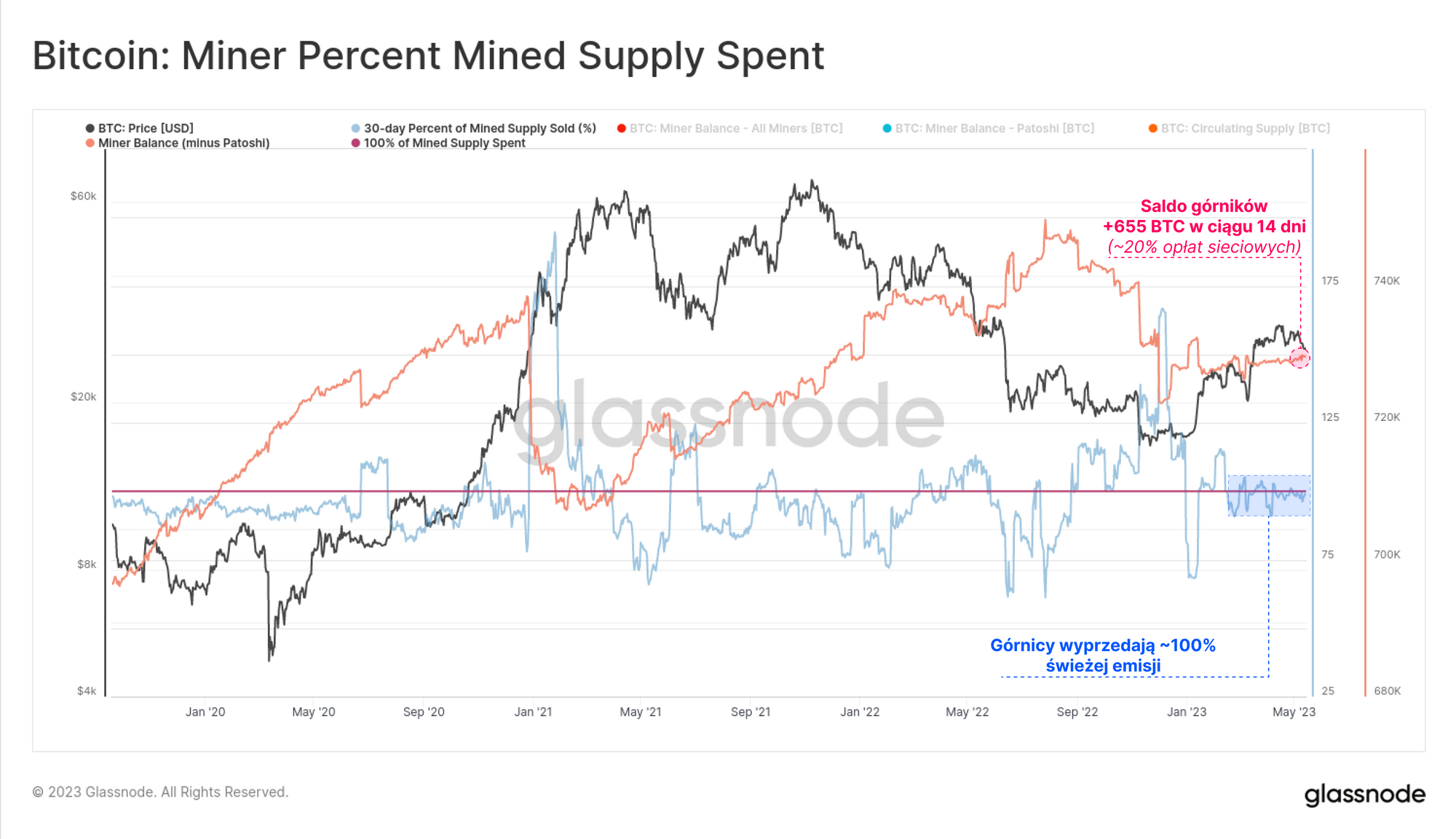 Spośród 3 275 BTC łącznych opłat przekazanych górnikom w ciągu ostatnich 2 tygodni, łączne saldo górników wzrosło tylko o 655 BTC, co stanowi około 20% opłat przekazanych. Niebieska linia na poniższym wykresie przedstawia proporcję nowo wydobytych BTC, które górnicy sprzedają, i nadal oscyluje wokół 100%.