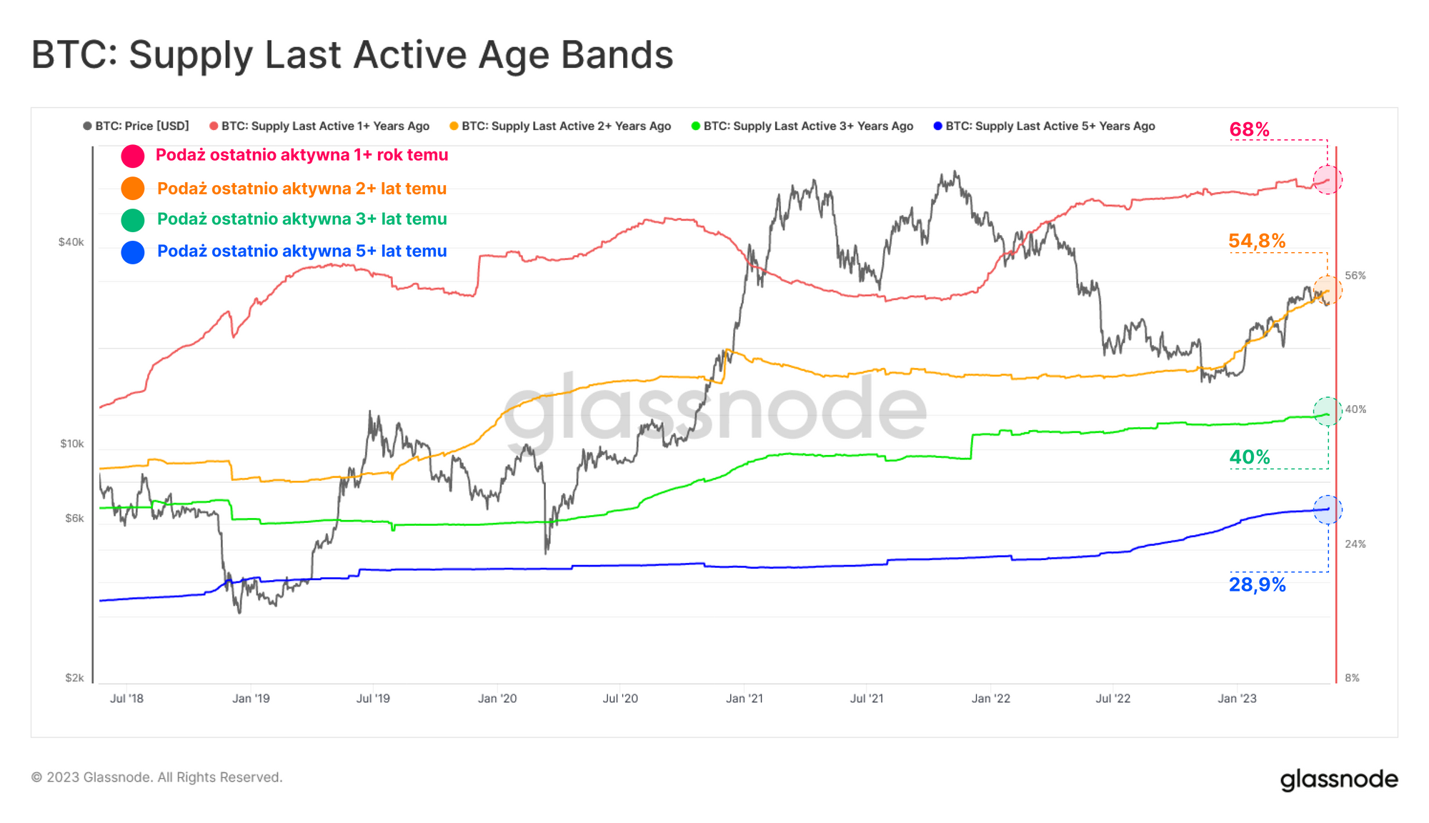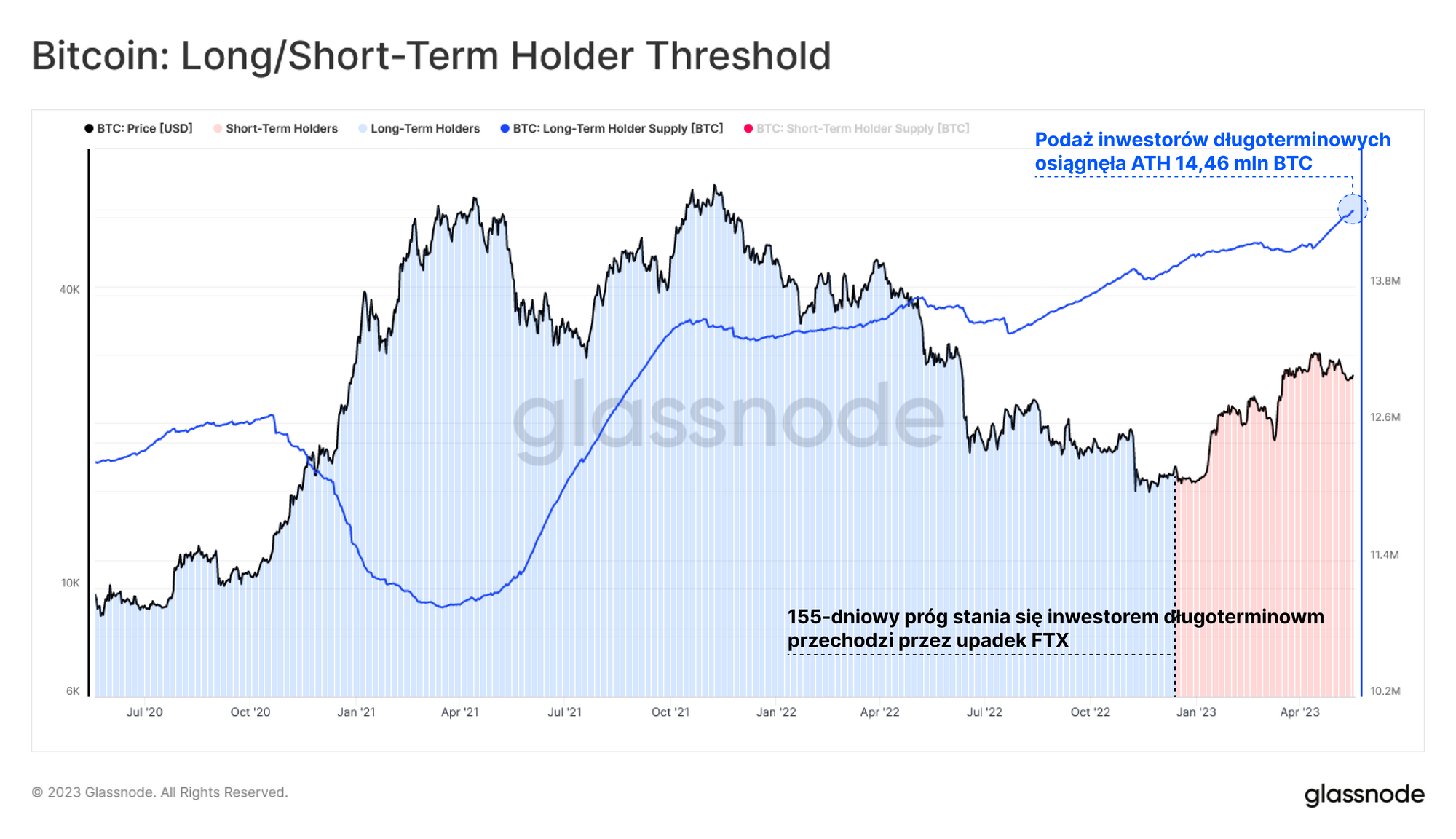 To zjawisko odzwierciedla się również w przypadku inwestorów długoterminowych, których podaż (coiny posiadane >155 dni) wynosi obecnie 14,46 mln BTC, co stanowi nowy najwyższy poziom w historii. Spowodowane jest to między innymi przez coiny nabyte bezpośrednio po upadku FTX, które obecnie osiągnęły status podaży LTH.