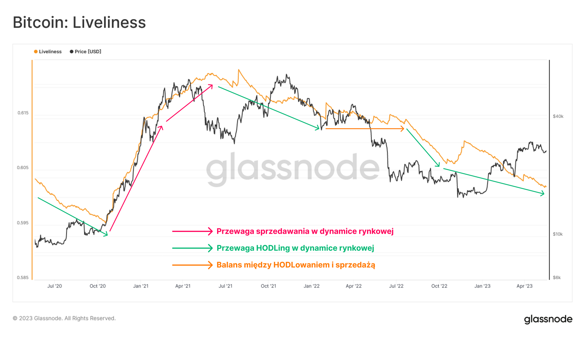 Zbieżność można także znaleźć we wskaźniku Żywotności (Liveliness), który porównuje względną równowagę pomiędzy HODLowaniem coinów a ich sprzedażą. Obecnie, wskaźnik Żywotności sieci maleje i osiąga najniższą wartość notowaną od momentu przebicia 20 000$ w grudniu 2020 roku. Trwałe spadki wskaźnika Żywotności potwierdzają, że HODLing stanowi aktualnie główną dynamikę większości podaży.