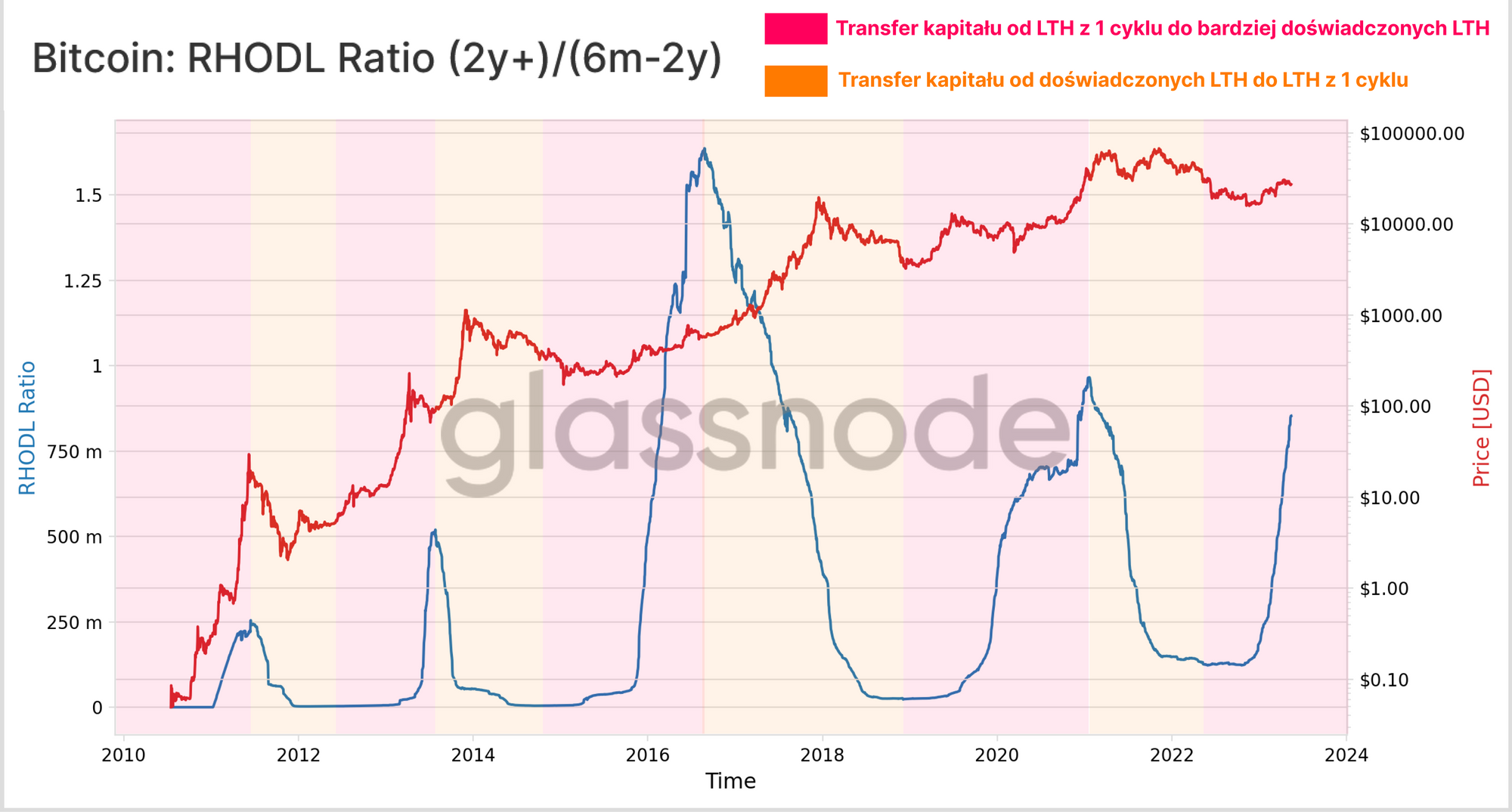 Możemy skorzystać również z nowej wersji wskaźnika RHODL, porównującej kapitał przechowywany w coinach, które mają 2 lata lub więcej, do tych w grupie wiekowej 6 miesięcy - 2 lata. Pomaga to ocenić równowagę między doświadczonymi inwestorami długoterminowymi (2 lata i więcej) a długoterminowymi inwestorami z jednego cyklu (6 miesięcy - 2 lata).