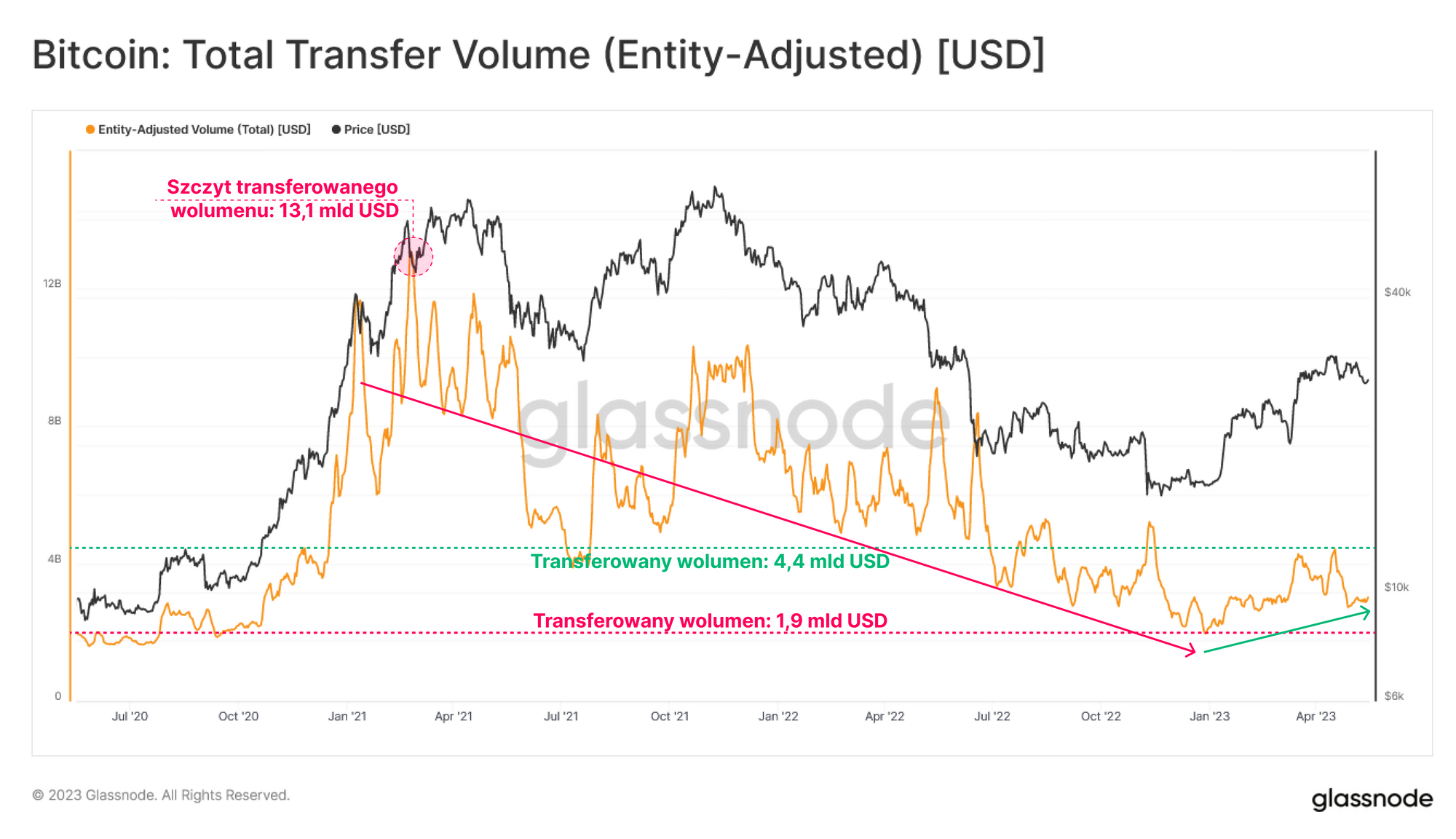 Analizując rozliczany przez sieć Bitcoina wolumen środków w ciągu ostatnich trzech lat, zauważamy dużą spadkową tendencję ogólnego przepływu ekonomicznego od początku 2021 roku, spadając z cyklicznego szczytu wynoszącego 13,1 mld dolarów do cyklicznego minimum na poziomie 1,9 mld dolarów, co stanowi spadek o 85,5%. Co prawda wolumeny transferowanych środków odnotowały niewielki wzrost w 2023 roku, jednak wciąż utrzymują się na niskim poziomie w przedziale od 1,9 mld do 4,4 mld dolarów.