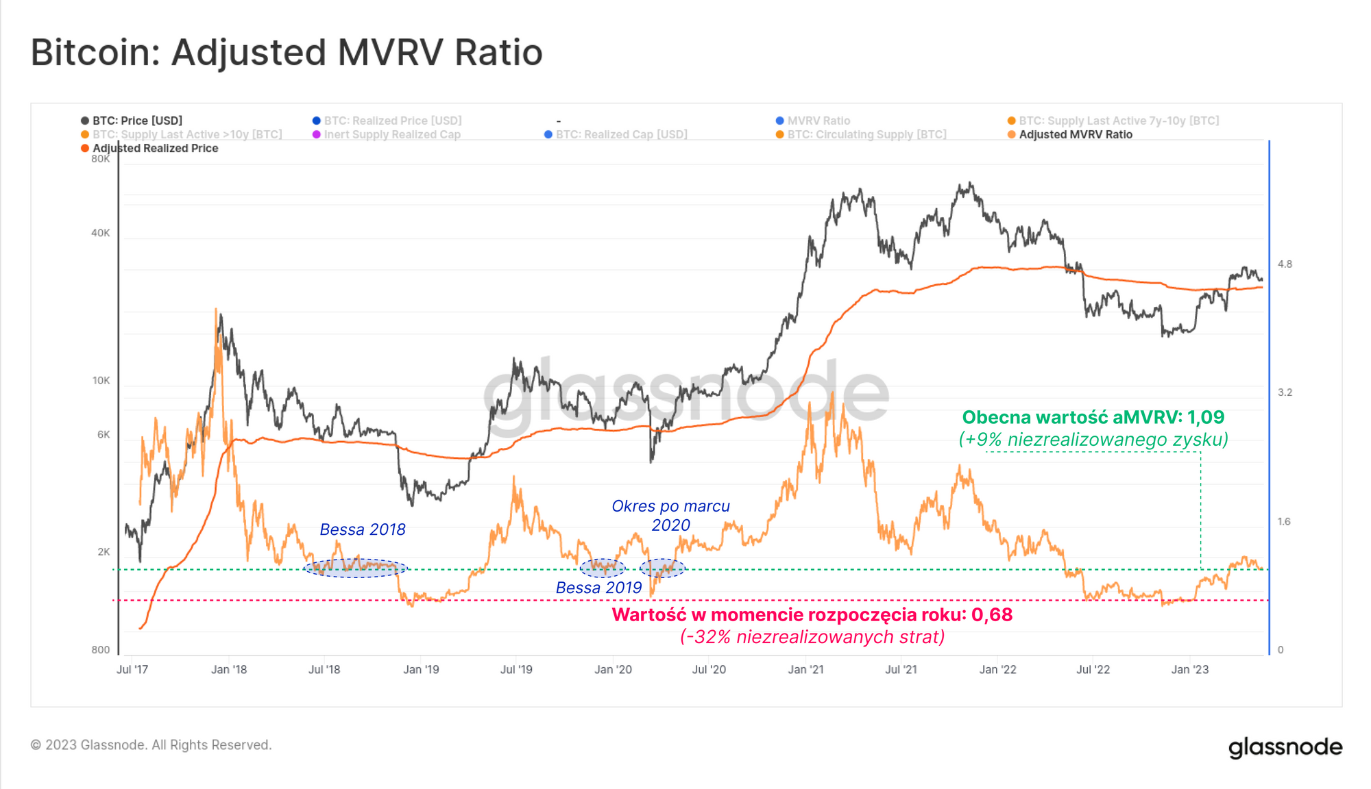 Obecnie aMVRV zanotowuje wartość 1,09, co sugeruje, że na rynku pozostaje tylko 9% niezrealizowanego zysku. Jest to zbieżne z historycznie wyprzedanymi poziomami obserwowanymi zarówno w dolnych punktach cyklu w 2018, 2019 roku, jak i w marcu 2020 roku.