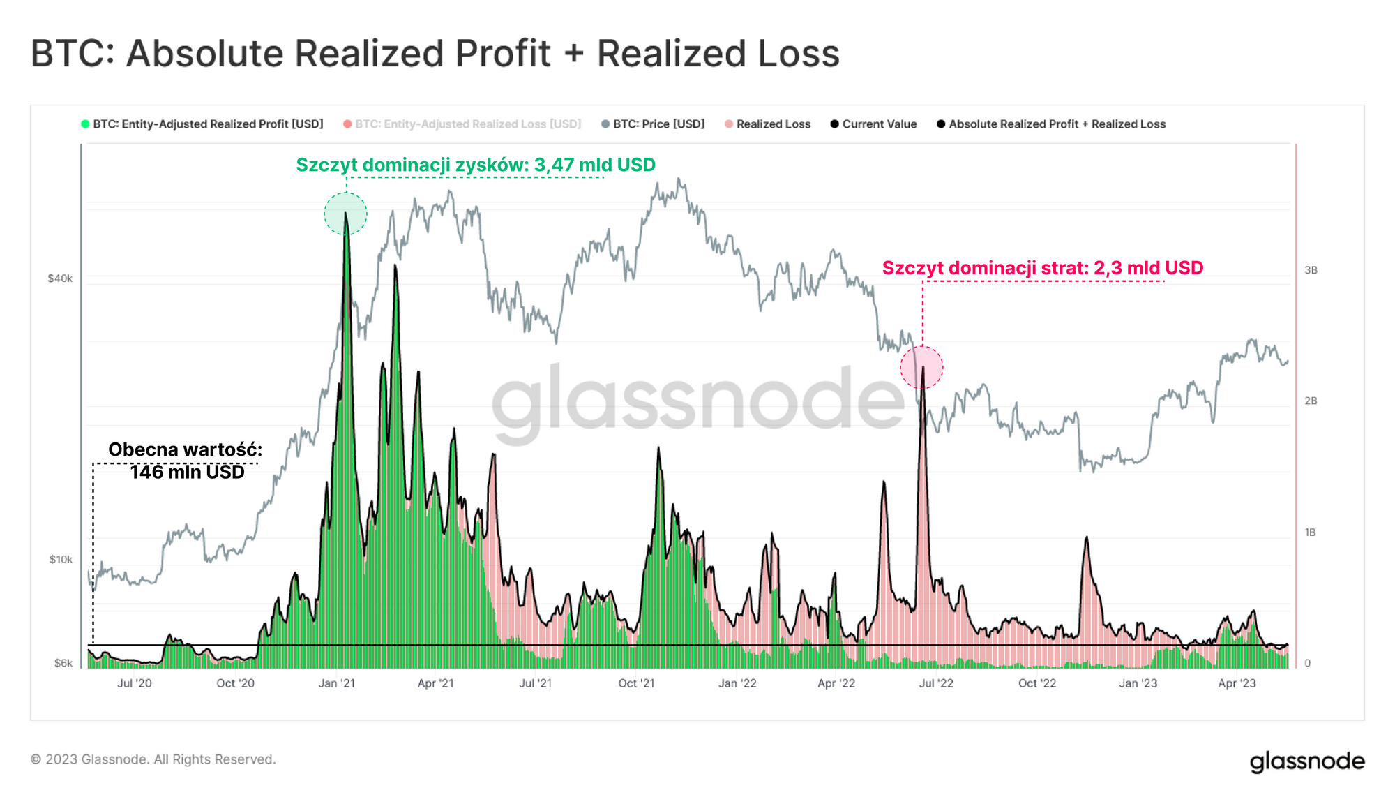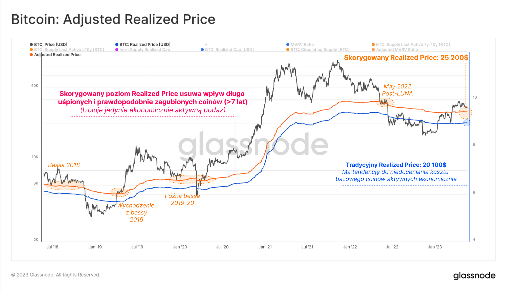 Aktualne ceny rynkowe są obecnie nieco powyżej Skorygowanego poziomu Realized Price (25 200$), co jest prawdopodobnie psychologicznym obszarem zainteresowania w przypadku pullbacku na rynku. Potwierdza to również tezę, że aktywni uczestnicy rynku nie mają możliwości obecnie zrealizowana znacznej ilości zysków (lub strat).