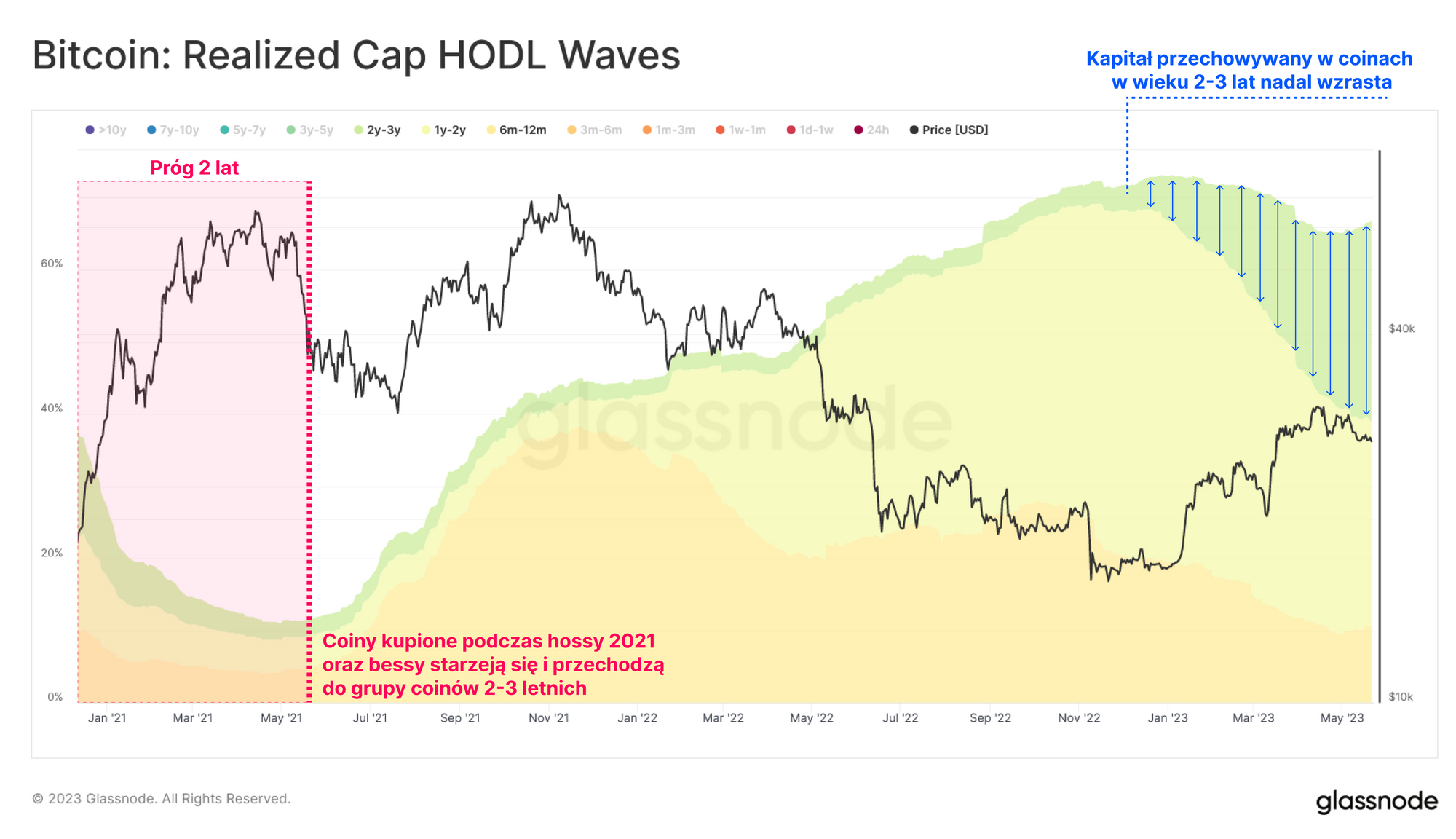 Po listopadowym dołku, kapitał wyrażony w dolarach ulokowany w coinach, które mają 2-3 lata, wzrósł z 3,1% do 27,7%, a spora część podaży dojrzała do przedziału 2 lat. Odnosi się to do podaży, która została nabyta po spadkach w maju 2021 roku, gdy notowania spadły z 56 000$ do 29 000$.