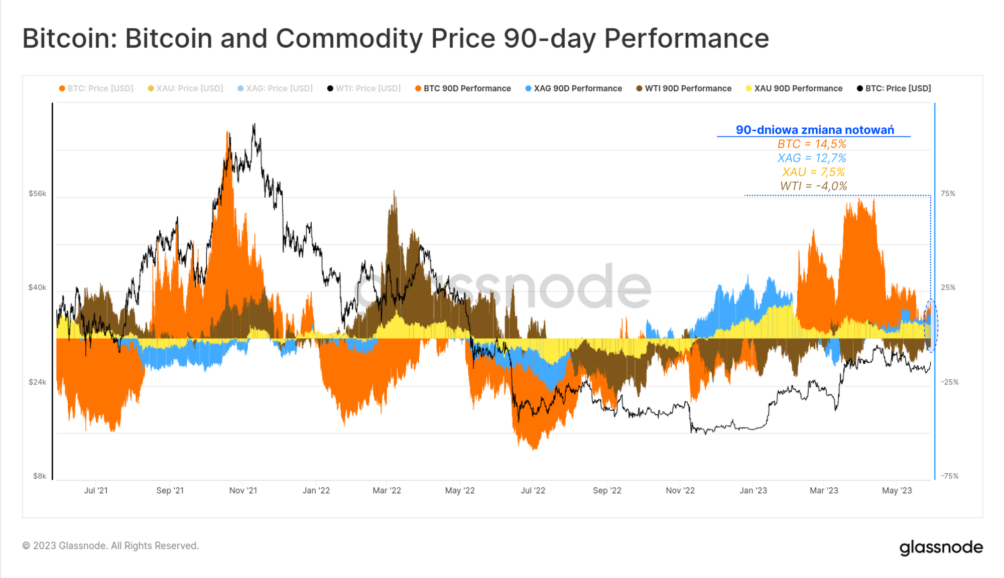 Od października 2022 roku płynność na globalnych rynkach notowała wzrosty, co spowodowało pozytywne reakcje i większe skorelowanie cen aktywów cyfrowych i metali szlachetnych. Obie te klasy aktywów obecnie przechodzą drugą korektę wzrostową w tym roku, z BTC i srebrem spadającymi o odpowiednio -10,8% i -10,6% od swoich 90-dniowych szczytów. Złoto trzyma się najlepiej, odnotowując dotychczasowy spadek o 5,4%, a ceny ropy naftowej WTI nadal mają trudności i poruszają się w ograniczonym zakresie, spadając o 12,1% od kwietniowego szczytu.