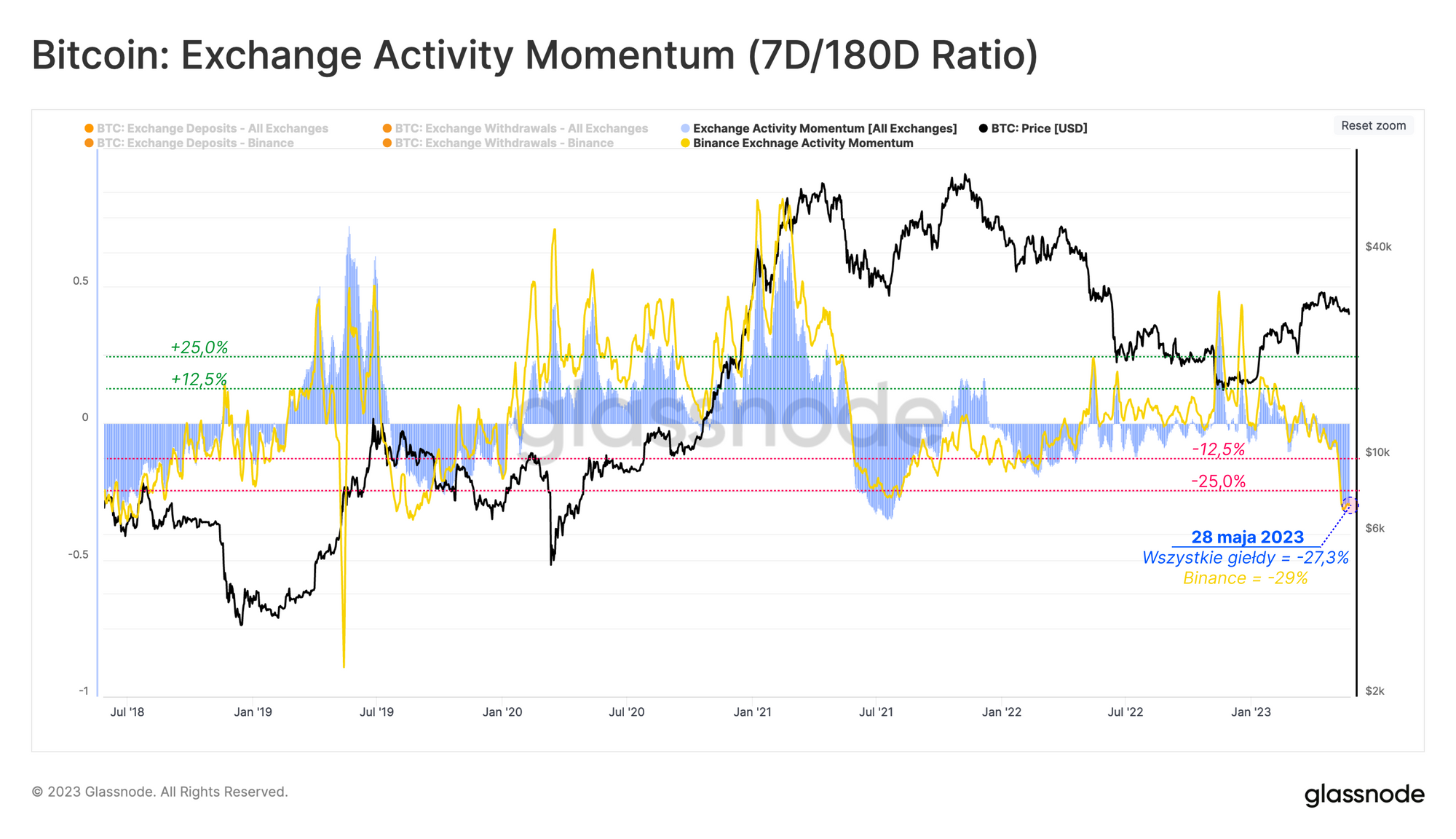 Wolumeny transferów on-chain pozostają cyklicznie niskie (newsletter z 21. tygodnia), co przekłada się na spadek aktywności związanej z giełdami. Aby oszacować tę tezę, możemy porównać liczbę wpłat/wypłat na giełdach, które mają miejsce dzisiaj, do średniej z ostatnich 6 miesięcy, co da nam wskaźnik aktywności.