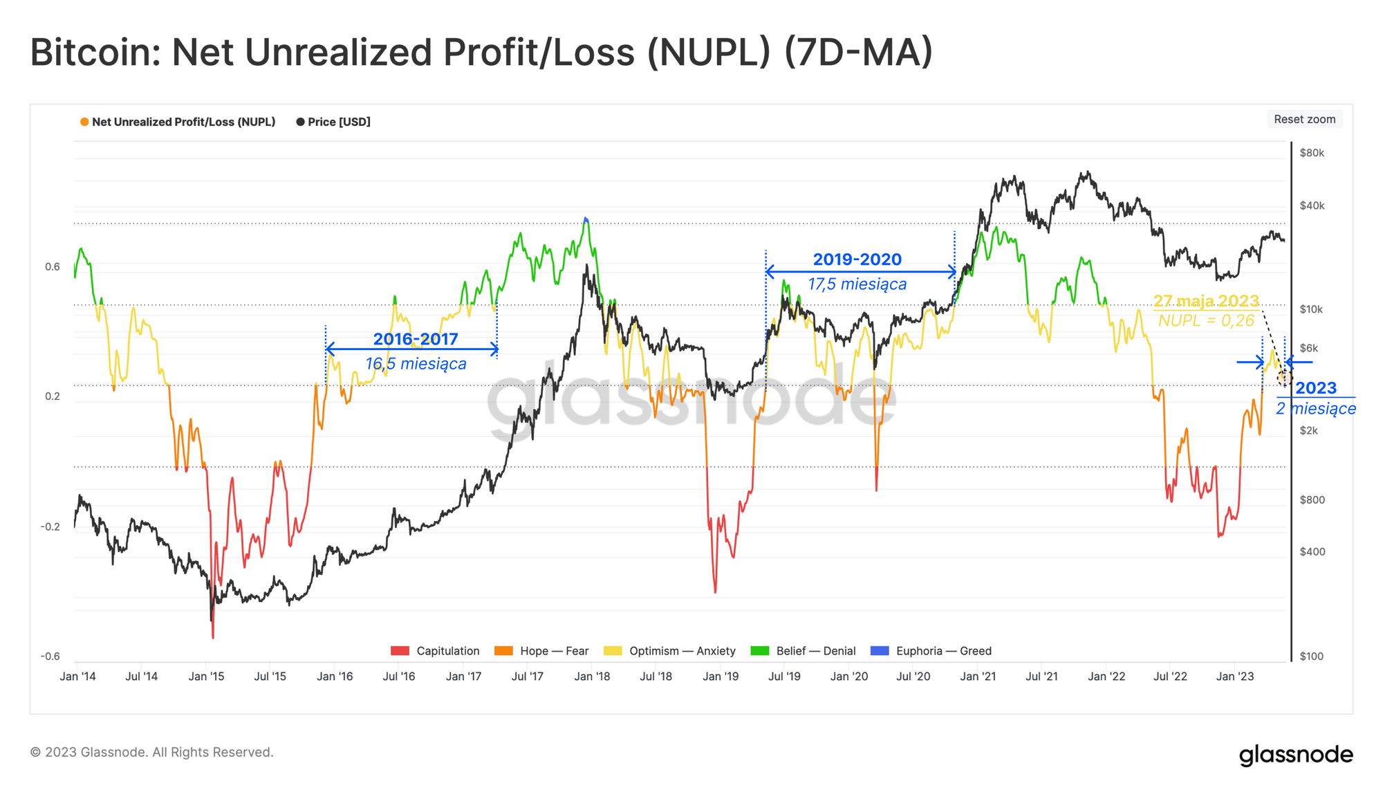 Obecna wartość NUPL wynosząca 0,29 znajduje się na dolnym zakresie fazy równowagi, do której zalicza się 37,5% wszystkich dni handlowych Bitcoina. Ta strefa została osiągnięta na początku marca 2023 roku i w ostatnich dwóch cyklach utrzymywała się przez około 16 miesięcy.