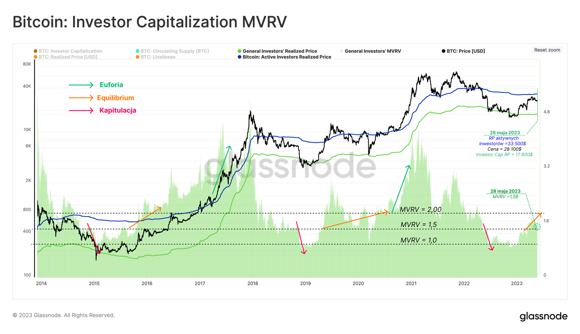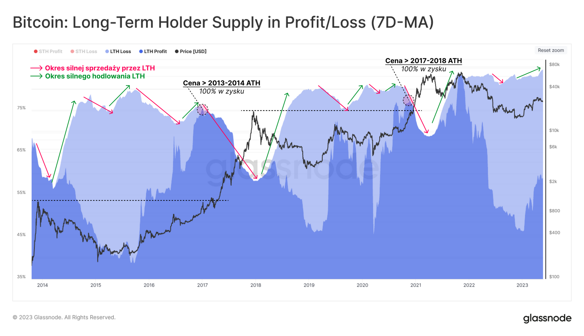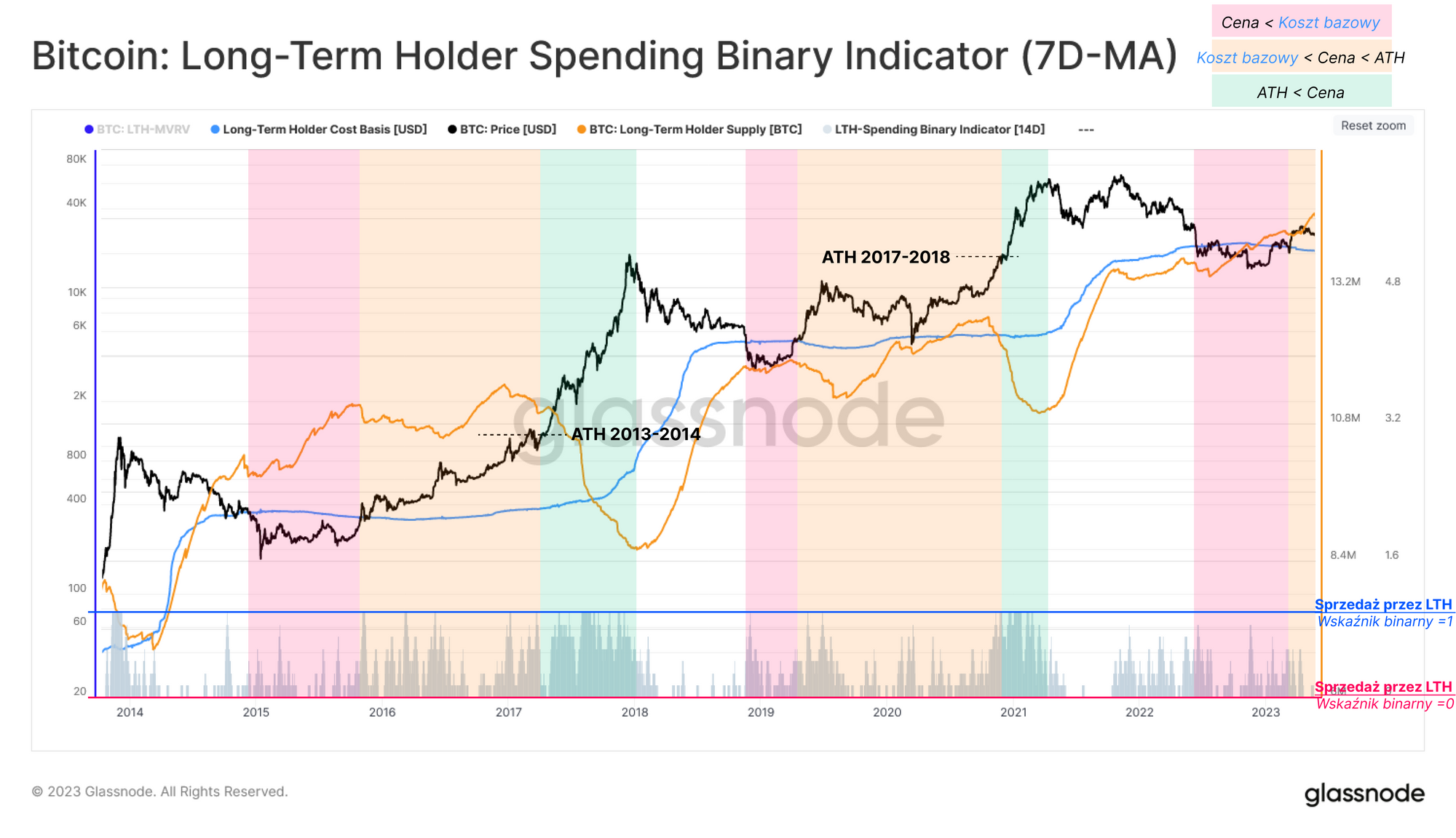 - Równowaga 🟧: Notowania powyżej kosztu bazowego inwestorów długoterminowych, ale poniżej poprzedniego ATH.