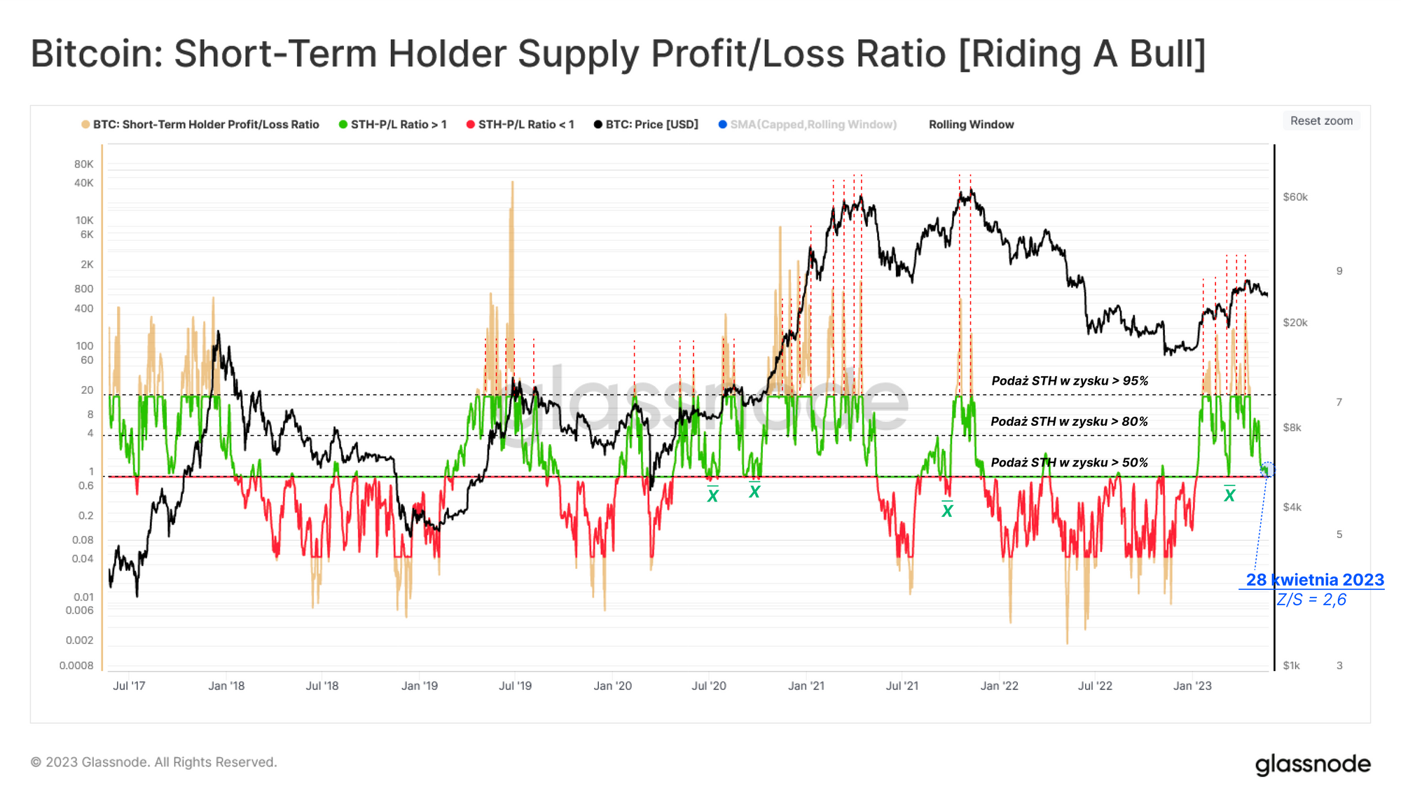 Wskaźnik niezrealizowanego zysku/straty inwestorów krótkoterminowych (STH) (wprowadzony w newsletterze z 18 tygodnia) uległ znacznemu ochłodzeniu, powracając do poziomu równowagi wynoszącego 1,0, a następnie wzrastając do 2,6. Wskazuje to na zrównoważoną pozycję zysku i straty świeżych inwestorów. Spadek poniżej tego poziomu zwykle poprzedza bardziej intensywne spadki cen, jednak rynek ma tendencję do znajdowania wsparcia na tym poziomie podczas hossy.
