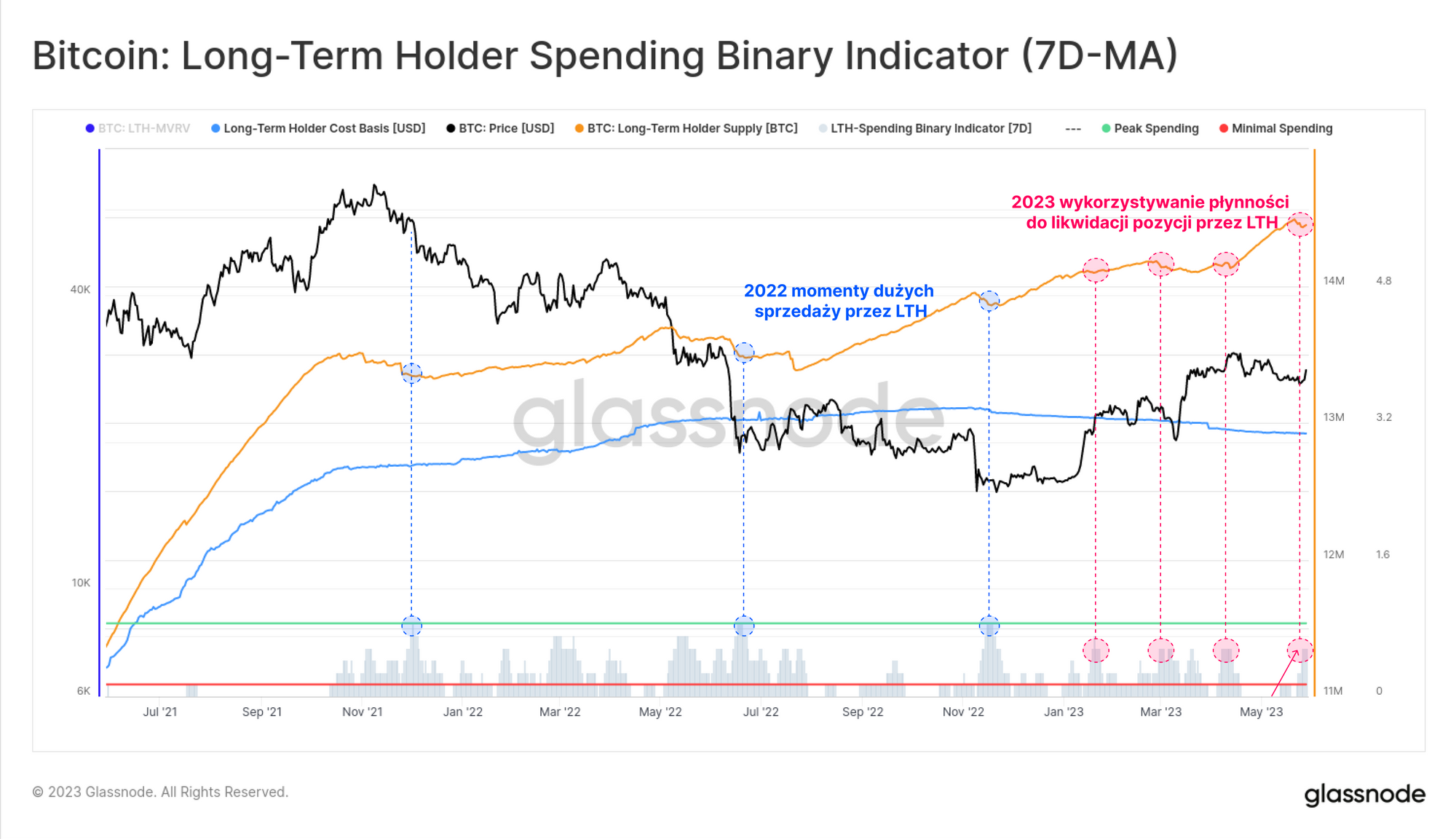 Następnie nałożymy na wykres performance rynku wraz z intensywnością sprzedaży inwestorów długoterminowych (zwykle związaną z realizacją zysków lub kapitulacją). Tutaj prezentujemy sprzedaż inwestorów długoterminowych za pomocą Binarnego Wskaźnika Wydatków (SBI), który śledzi, czy sprzedaż inwestorów długoterminowych odbywa się z intensywnością wystarczającą, aby zmniejszyć łączną uśrednioną 7-dniową podaż inwestorów długoterminowych.