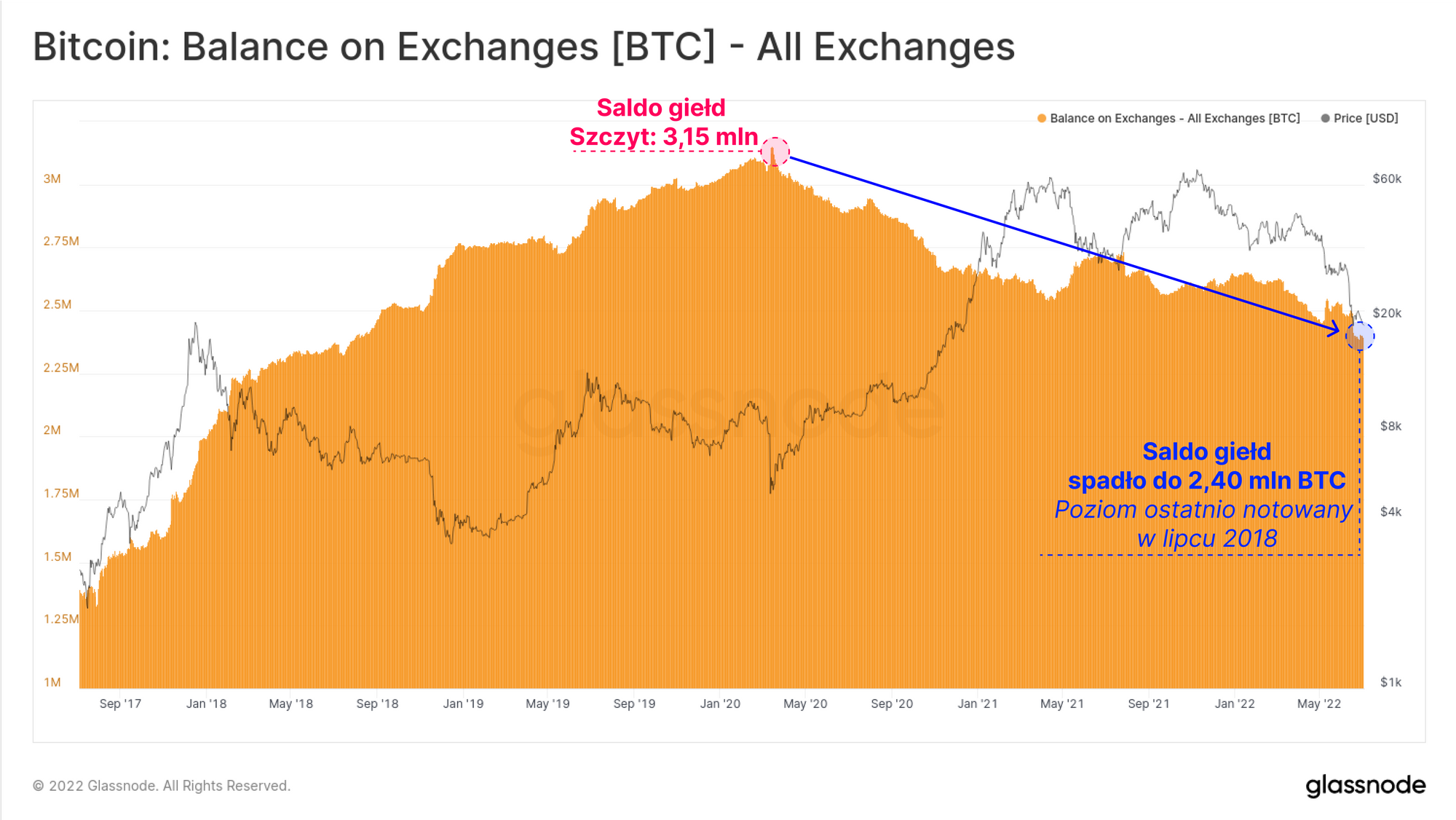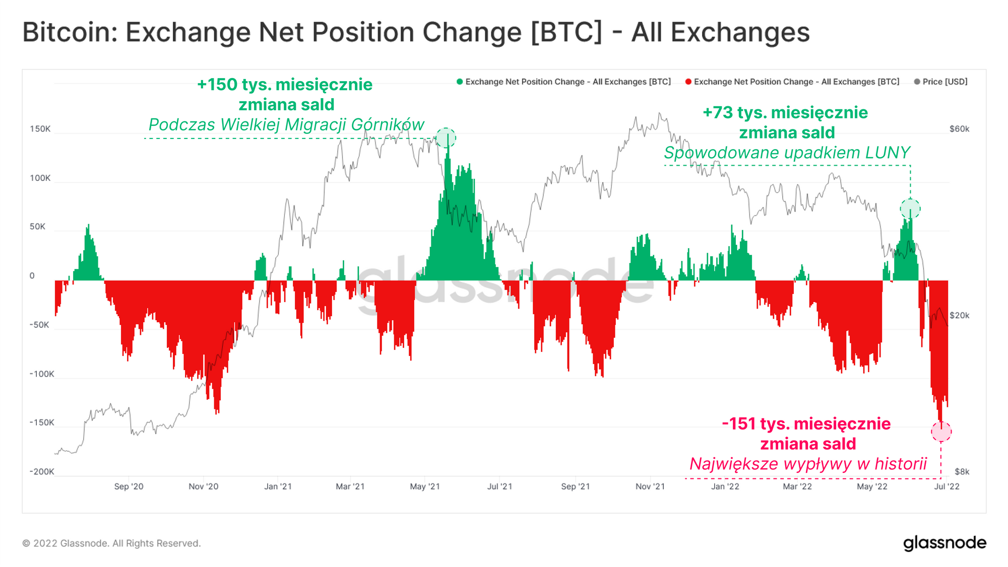 Równolegle do historycznie słabego miesiąca w kwestii notowań, giełdy doświadczyły największego miesięcznego zmniejszenia swojego salda, w tempie osiągającym ostatnio 150 tys. BTC na miesiąc. Stanowi to zmniejszenie ich balansu o 5,0-6,0% w czerwcu. To zupełne przeciwieństwo do powodzi coinów wpływających na giełdę, która miała miejsce w maju-czerwcu 2021 roku.