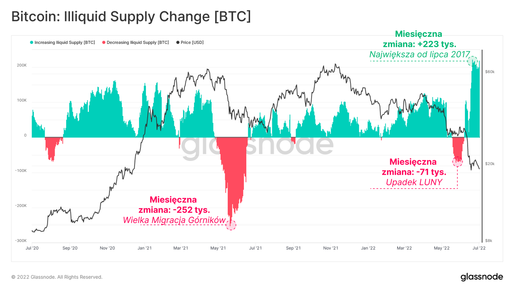 Największej zmianie balansu giełd towarzyszy największa od czerwca 2017 roku zmiana niepłynnej podaży. Wzrosła ona o 223 tys. BTC w czerwcu, przedstawiając ogromną migrację coinów do portfeli z małą lub zerową historią sprzedaży (ogólnie mówiąc - nie giełd).