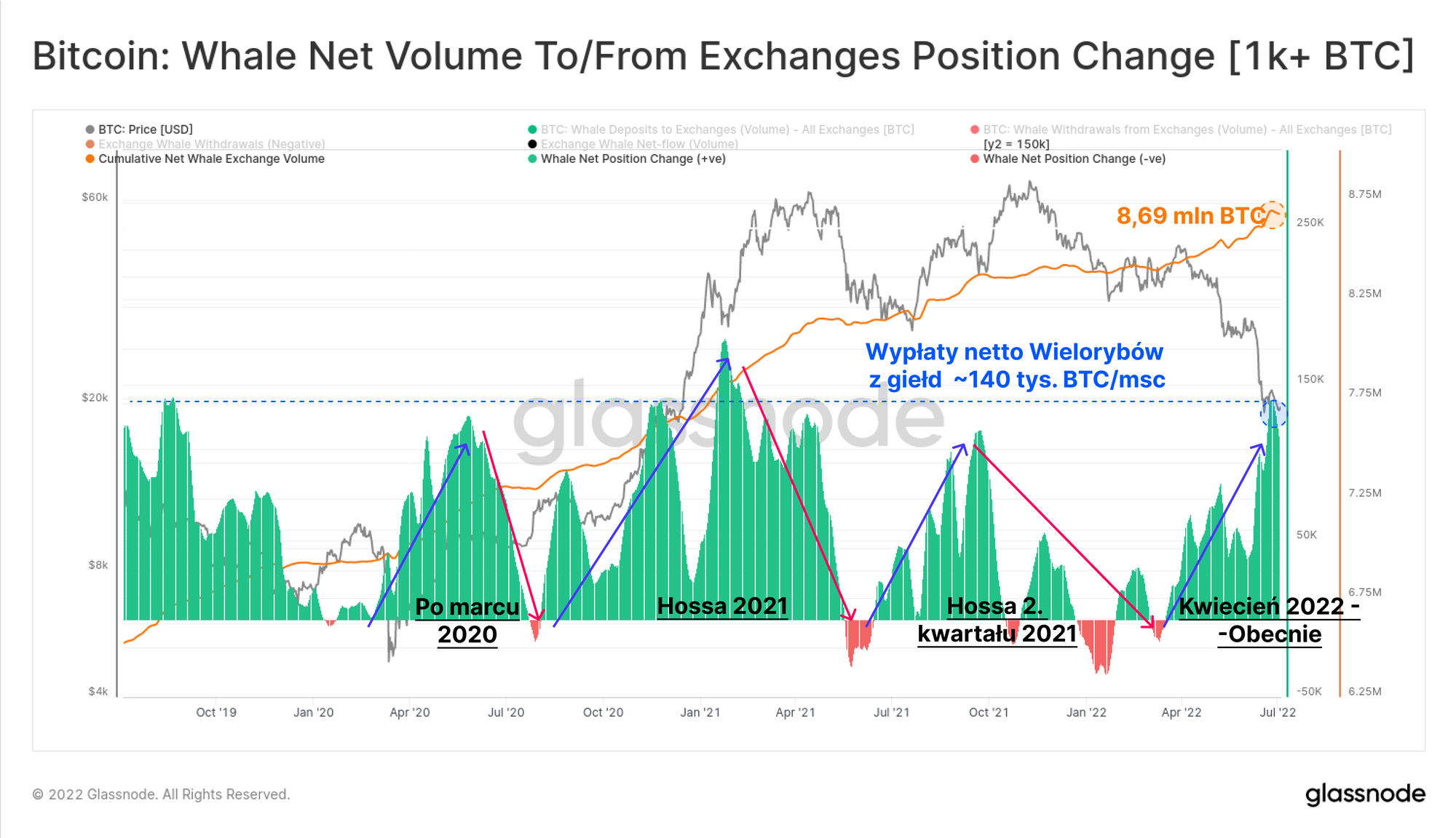 Kończąc, wykres poniżej pochodzi z naszego wskaźnika Wolumen Wielorybów na/z Giełd, w którym jako Wieloryb definiowany jest podmiot powyżej 1 tys. BTC (nie wliczając górników, ani giełd).