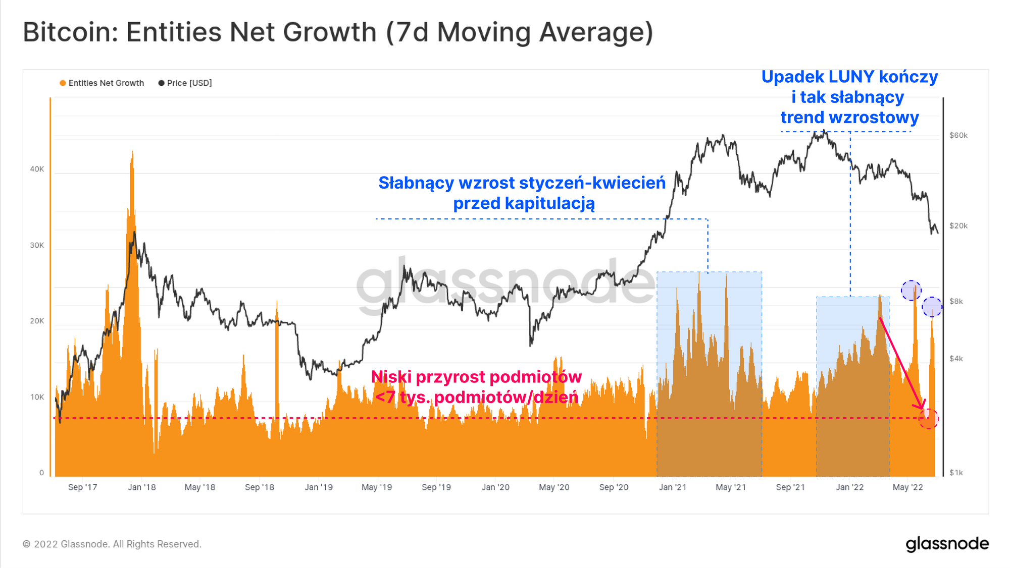Kapitulację uczestników można łatwo dostrzec poprzez krach w przyroście podmiotów netto, który pokazuje różnicę on-chain między nowymi i opuszczającymi sieć podmiotami. Za wyjątkiem dwóch dużych skoków podczas upadku LUNY oraz spadków pod koniec czerwca, ogólne tempo wzrostu jest co najmniej słabe.