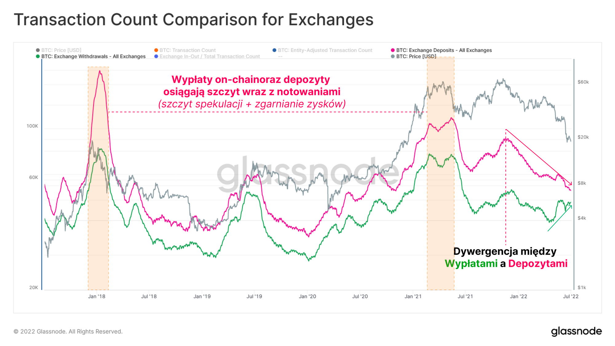 Biorąc podwyższone szacunki inflacji w USA za czerwiec oraz nadciągające chmury możliwej recesji, rynek pozostaje nieskłonny do inwestowania w ryzykowne aktywa. Jest to widoczne w wydajności i aktywności sieci Bitcoina, która to nieco spadła pod tymi względami w ostatnich tygodniach. Mając na uwadze, iż aktywność w sieci jest obecnie na poziomach podobnych do głębokiej fazy bessy w 2018 oraz 2019 roku, wydaje się, że doszło do niemal całkowitej czystki rynkowych turystów.
