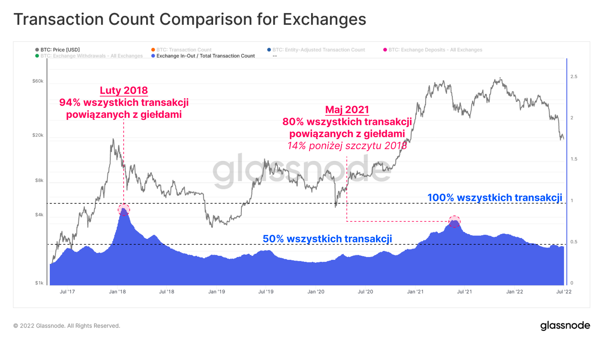 Dominacja transakcji związanych z giełdami osiągnęła szczyt niemalże natychmiastowo po szczycie hossy zarówno w 2017 roku i 2021 roku, stanowiąc 80-94% całej aktywności na sieci. Naznacza to ostatnie tchnienie napływu turystyki rynkowej, gdy nowi uczestnicy kupują szczyt tuż przed spadkiem ceny, a następnie są konsekwentnie wykruszani z rynku.