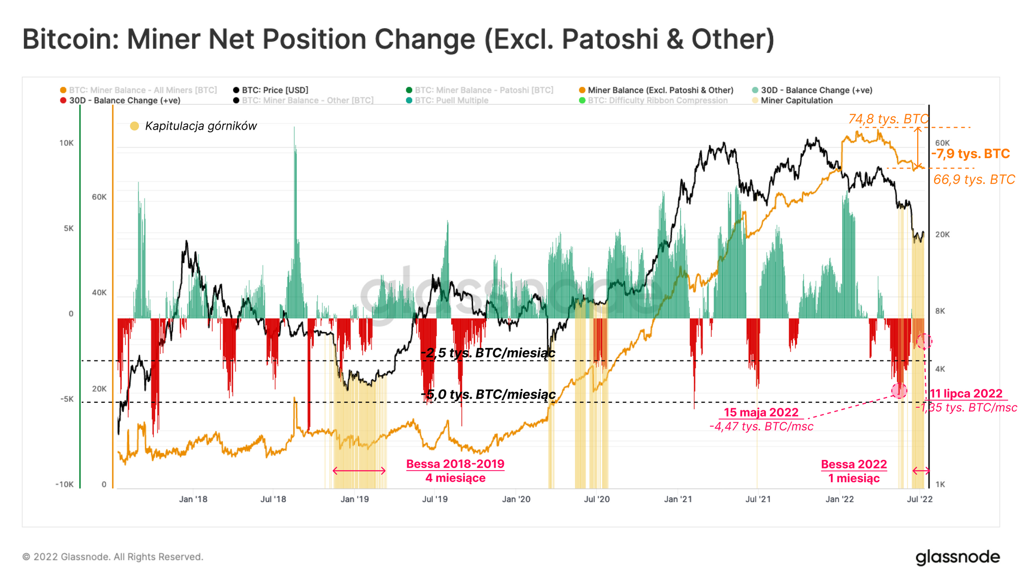 Czas trwania kapitulacji górników podczas bessy 2018-2019 wynosił około 4 miesięcy, a obecny cykl rozpoczął się 1 miesiąc temu. Górnicy posiadają łącznie około 66,9 tys. BTC, a zatem następny kwartał prawdopodobnie będzie dalej zagrożony kontynuacją dystrybucji, chyba że ceny coinów znacznie wzrosną.