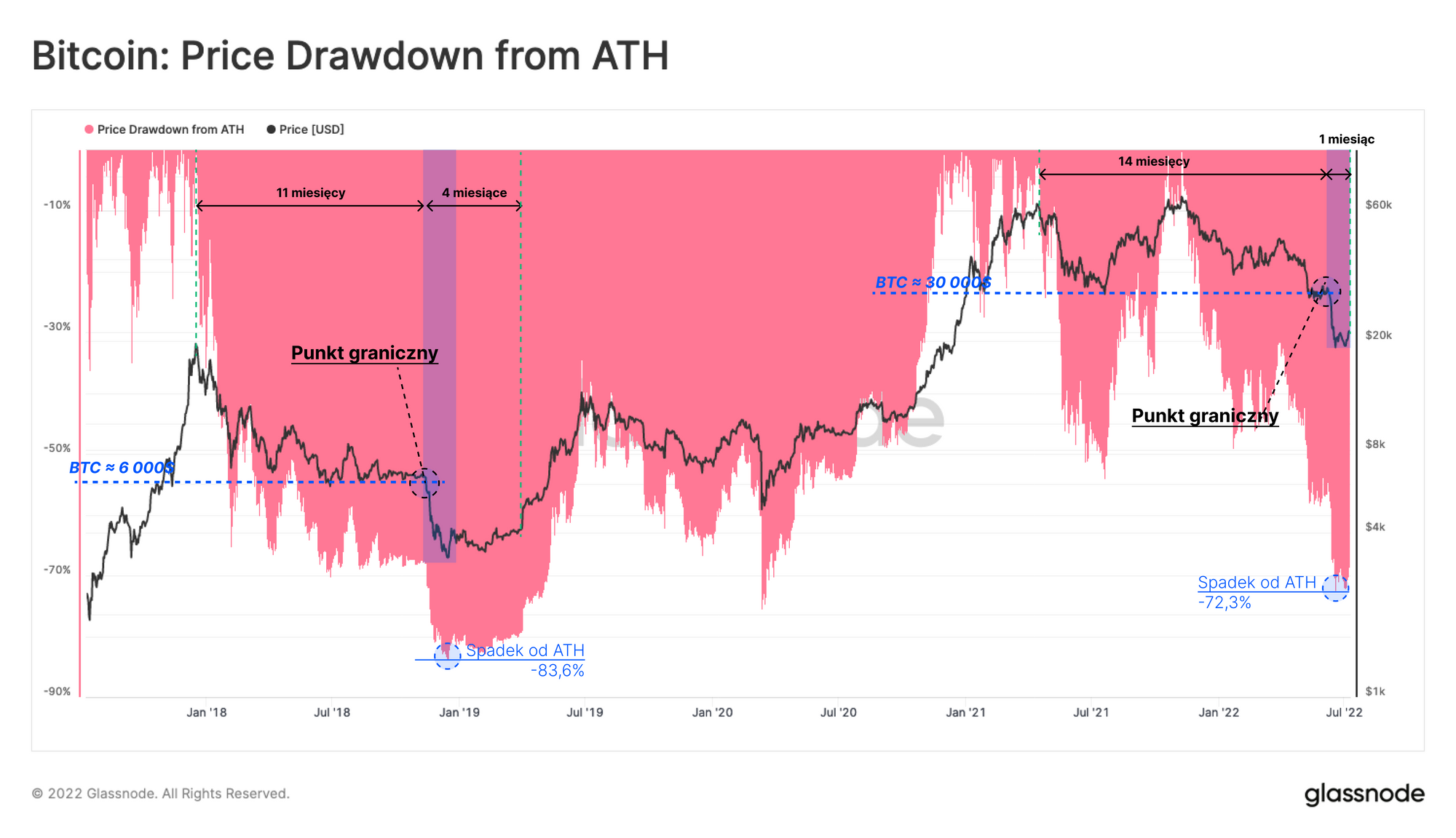- Listopad 2021 - lipiec 2022: obecna bessa odnotowała maksymalny spadek rzędu 75%, a dołek na poziomie 29 000$ odegrał podobną rolę, jak omówiony powyżej punkt graniczny. Ostatnia kapitulacja w połowie czerwca spowodowała spadek cen o 40% do 17 600$ w ciągu zaledwie dwóch tygodni.