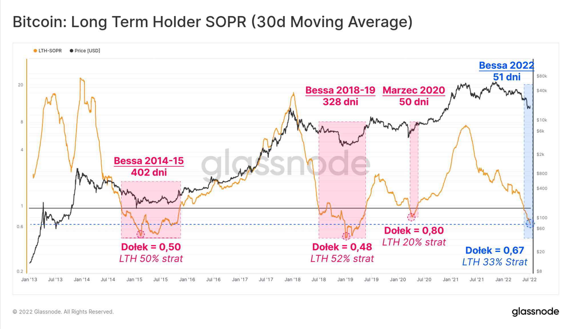 Wskaźnik SOPR inwestorów długoterminowych jest metryką, która wskazuje odsetek zysku zrealizowany przez LTH (na przykład wartość 2,0 oznacza, że LTH sprzedają coiny po cenie 2x wyższej od ich kosztu bazowego, kosztu zakupu). Zatem, gdy LTH-SOPR wynosi mniej niż jeden, inwestorzy ci realizują straty lub sprzedają coiny po cenach niższych niż ich koszt bazowy.