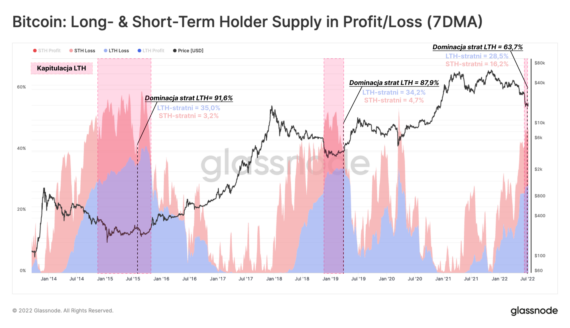 Formowaniu dna często towarzyszą inwestorzy długoterminowi dźwigający na swoich barkach coraz to większe niezrealizowane straty. Innymi słowy, aby bessa osiągnęła ostateczne dno, odsetek coinów trzymanych na stracie powinien być przetransferowany do tych, którzy są najmniej wrażliwi na zmiany cenowe i mają najsilniejsze przekonanie.