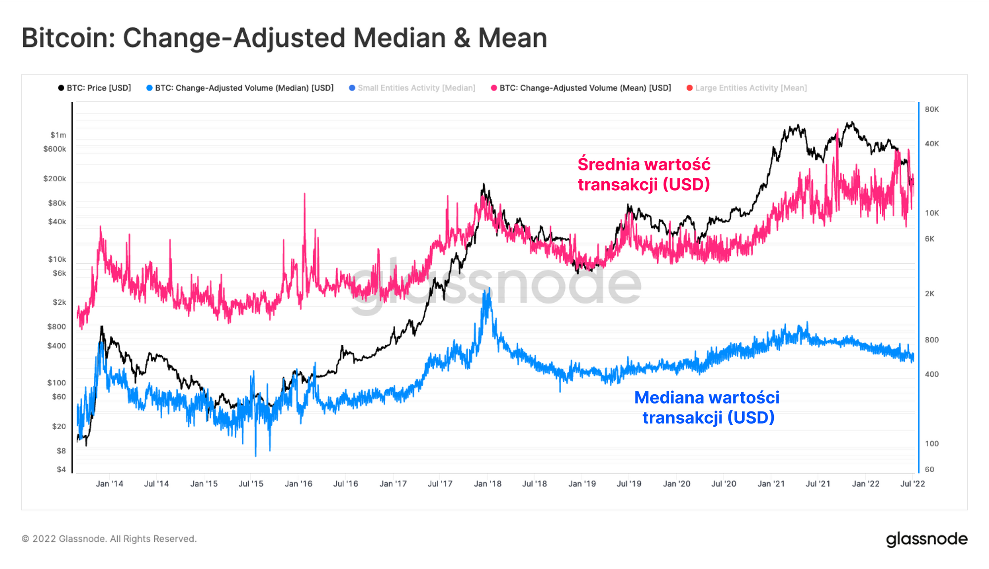 Biorąc pod uwagę historyczne dane transakcyjne Bitcoina, średnia wartość dziennego wolumenu transferu była zazwyczaj większa niż wartość mediany. Jest to w dużej mierze wynikiem większej liczby transakcji o małej wartości i mniejszej ilości transakcji o dużej wartości.