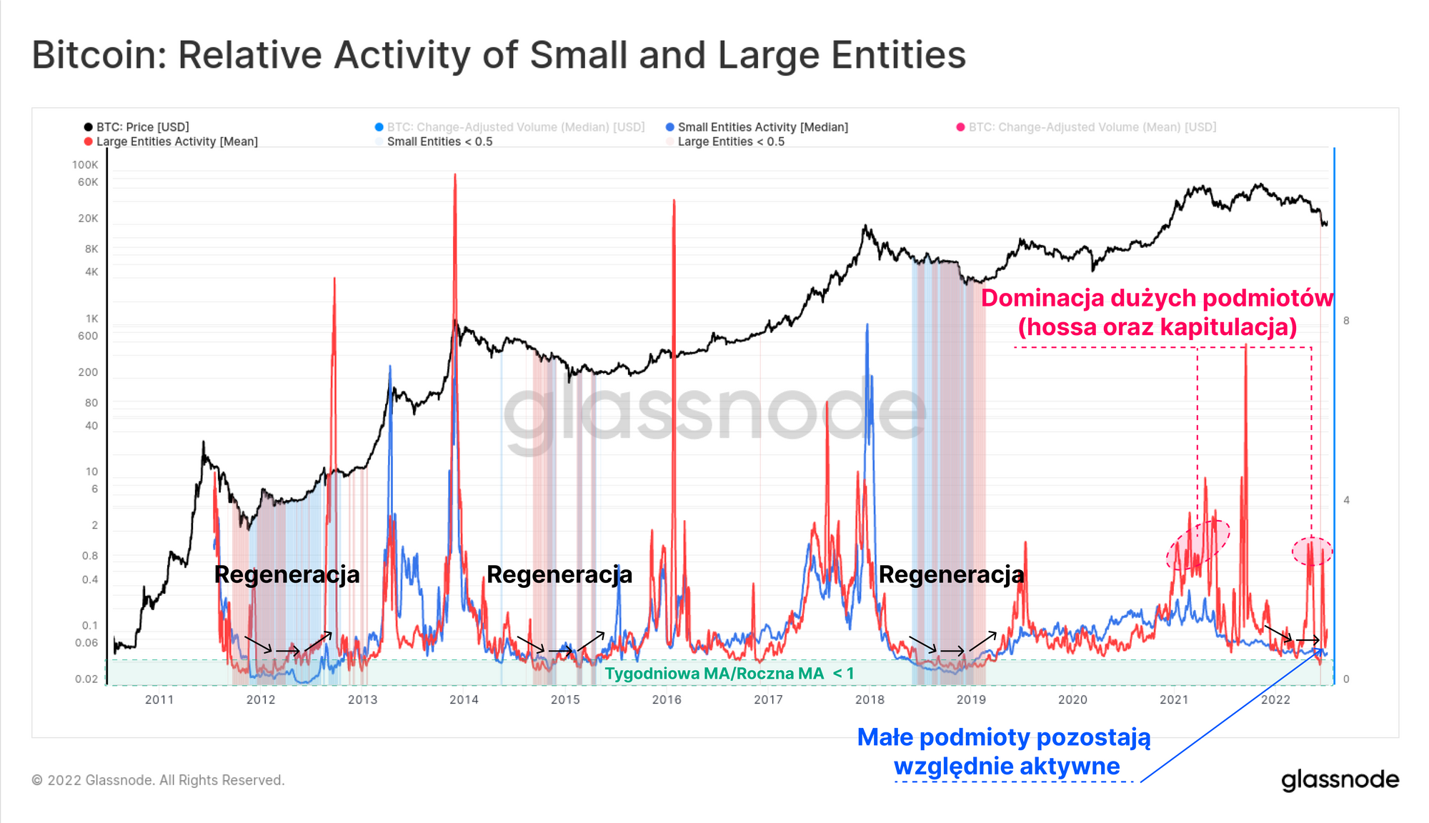 Podaż będąca na stracie osiągnęła poziom 44,7%, z czego większość przypada na grupę inwestorów długoterminowych. Pozostaje to jednak na mniej dotkliwym poziomie w porównaniu do poprzednich bess. Wprowadziliśmy także nowy wskaźnik do śledzenia poziomu aktywności małych i dużych podmiotów, jako narzędzie do mapowania ożywienia na rynku. Potwierdza to obserwację, że rynek znajduje się w głębokiej bessie, jednakże nadal nie uformował pewnego dna i wciąż sporo przed nami.