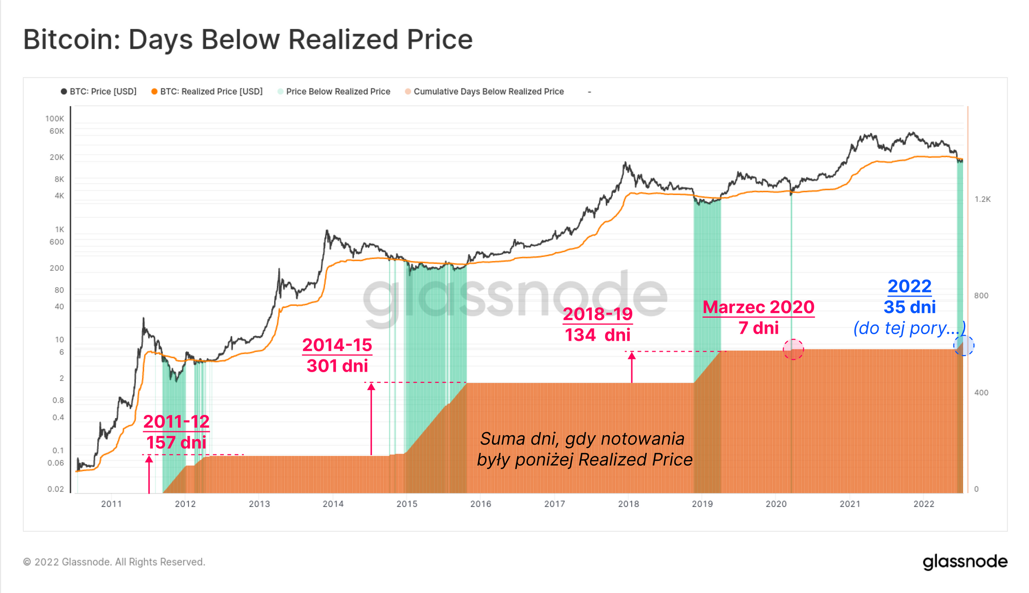 Jeśli wykluczymy marzec 2020 roku (gwałtowne załamanie rynku), średni czas spędzony poniżej poziomu Realized Price wynosi 197 dni. Dla porównania, w obecnym cyklu jest to dopiero 35 dni.
