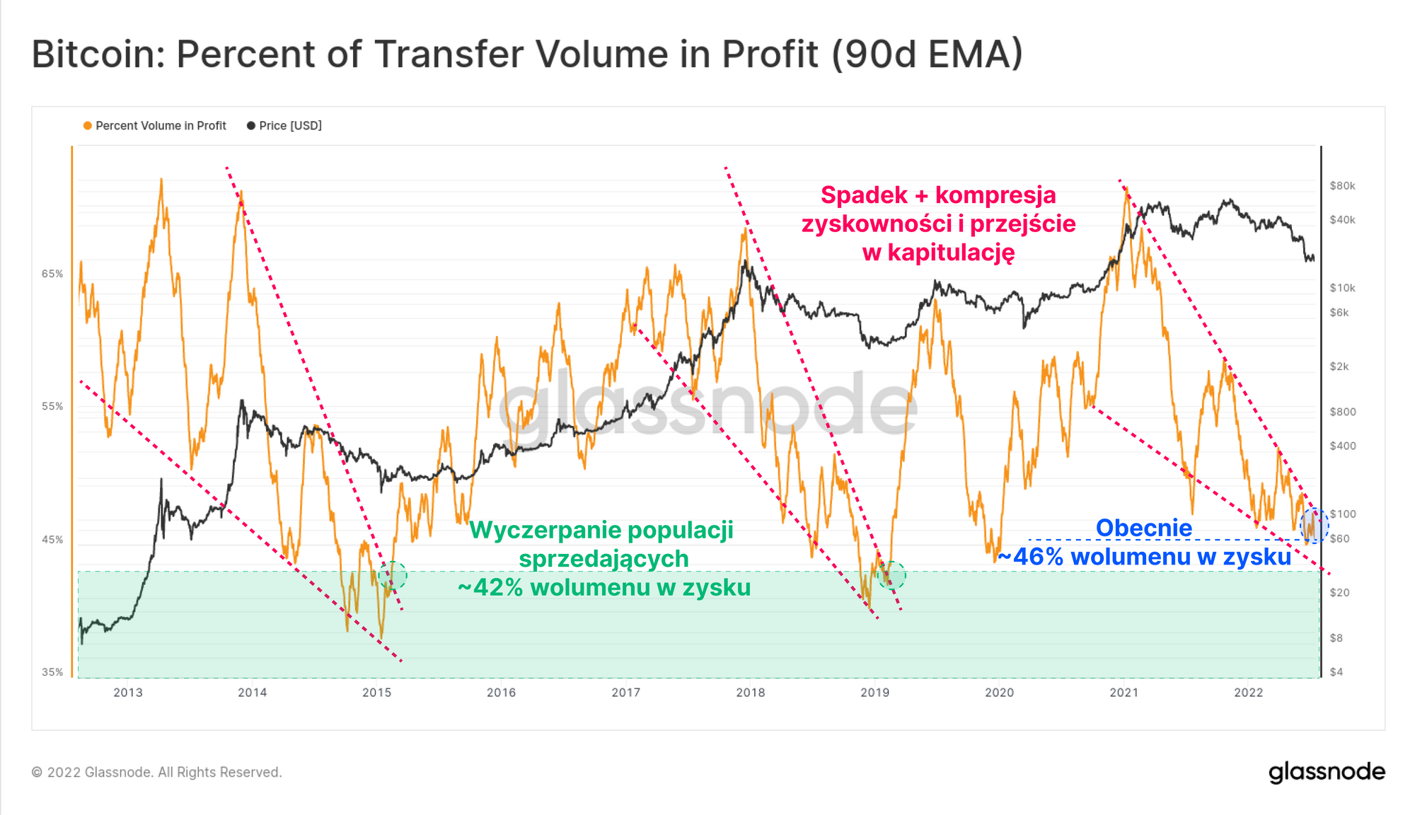 Odsetek transferowanego wolumenu w zysku także ma strukturę podobną do dołków w poprzednich bessach. W fazie kapitulacji w 2015 oraz 2018 roku ponad 58% transferowanego wolumenu odnotowywało stratę, a dynamika ta uległa kompresji po wielu miesiącach spadków.