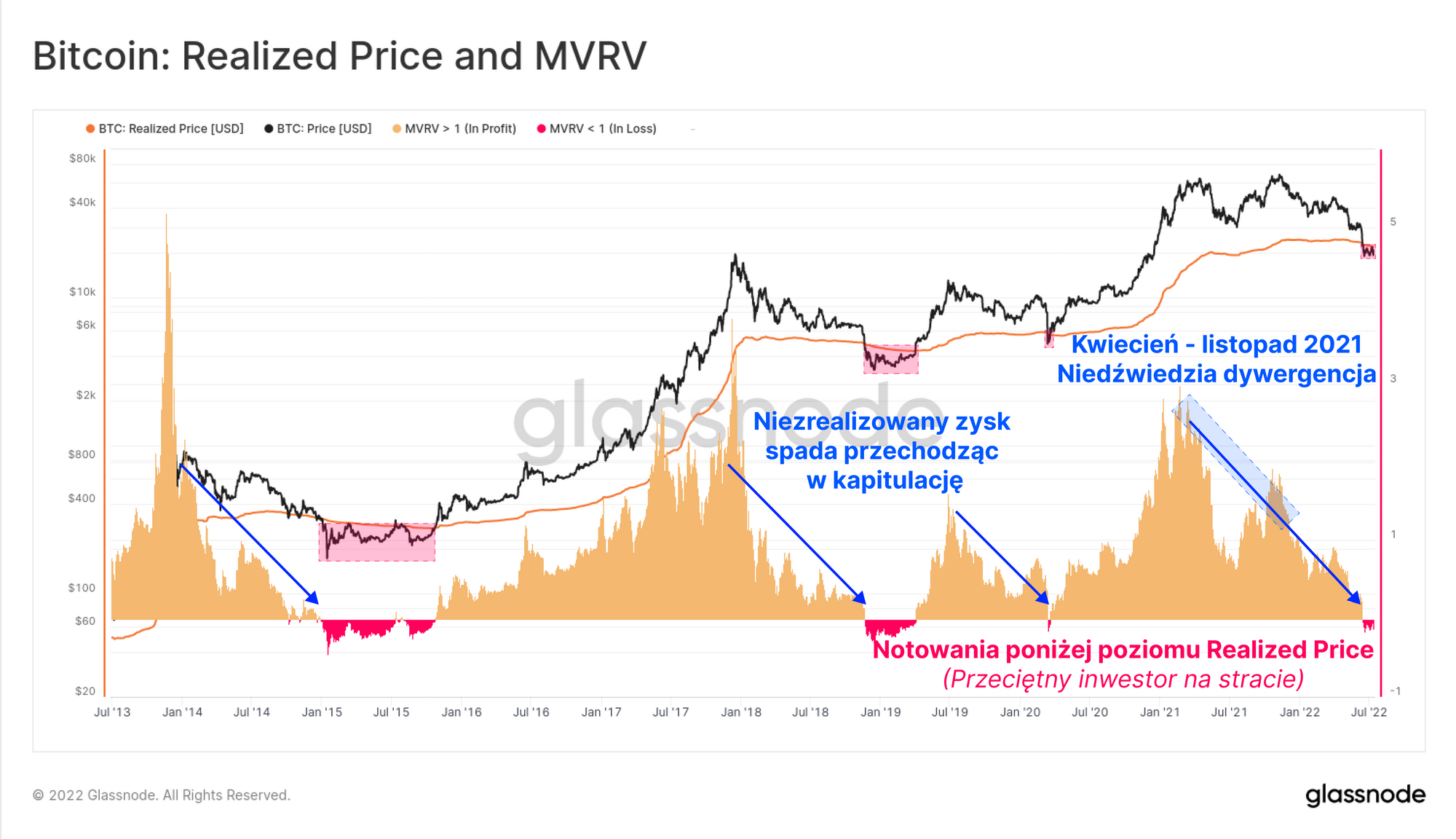 - Spadające wartości MVRV (🔵) oznaczają zmniejszanie się zyskowności na sieci. Jest to wynikiem zarówno spadków notowań (niższe MV; niższa cena rynkowa), jak i redystrybucji coinów, gdy inwestorzy realizują zyski i sprzedają coiny nabyte po niższych cenach nowym nabywcom skłonnym zapłacić wyższą cenę (wyższe RV; wyższy koszt bazowy). W wyniku tego mechanizmu można zaobserwować dużą niedźwiedzią dywergencję między ATH z kwietnia i listopada 2021 roku.