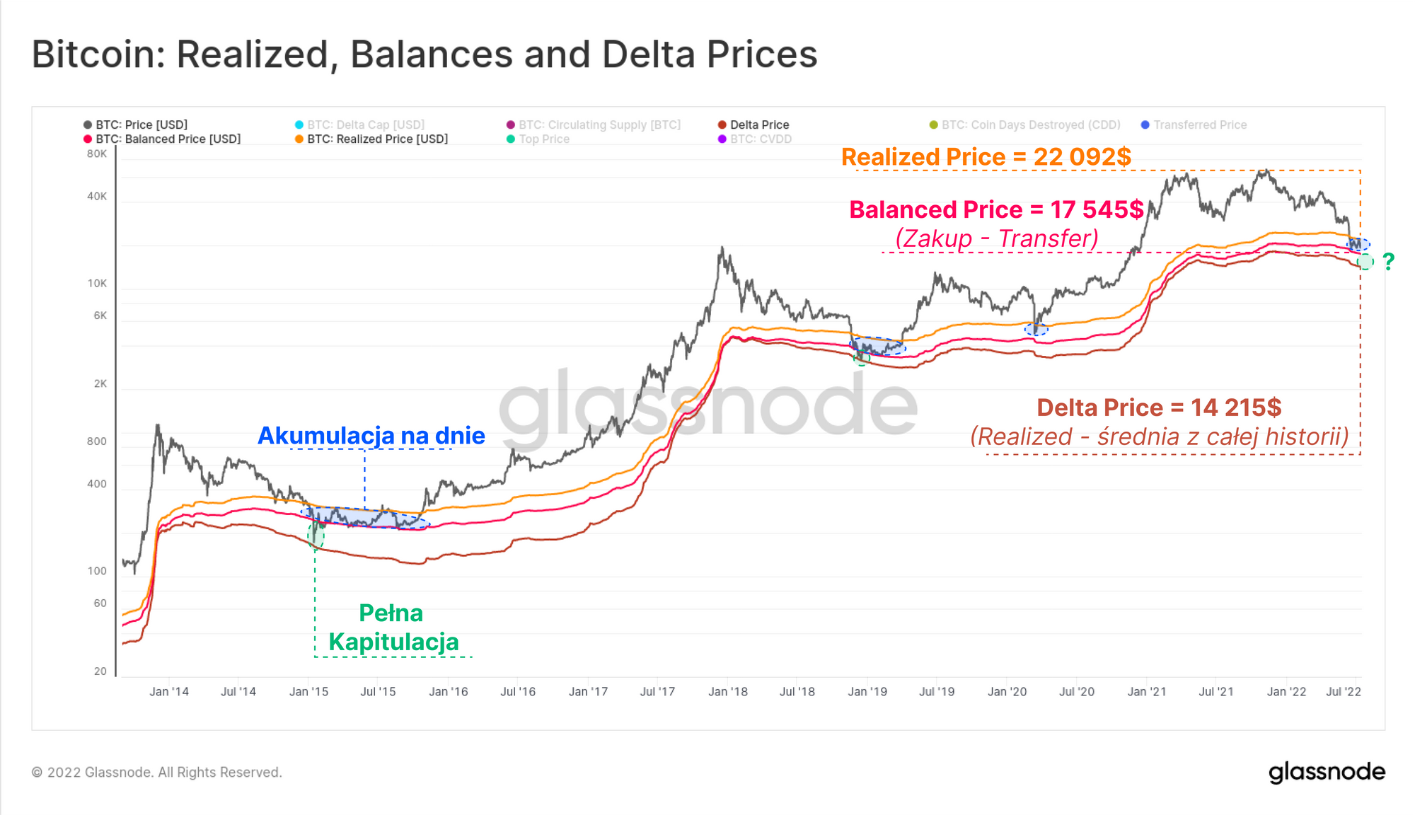 Zarówno dołki z 2015, jak i 2018 roku zostały ustanowione z krótkoterminowym knotem sięgającym co poziomu Delta Price (zielona strefa). Jednakże oba zakresy akumulacji większość procesu formowania dna spędziły notując ceny między poziomem Balanced Price (dolny zakres), a poziomem Realized Price (górny zakres), jak pokazano na niebiesko.