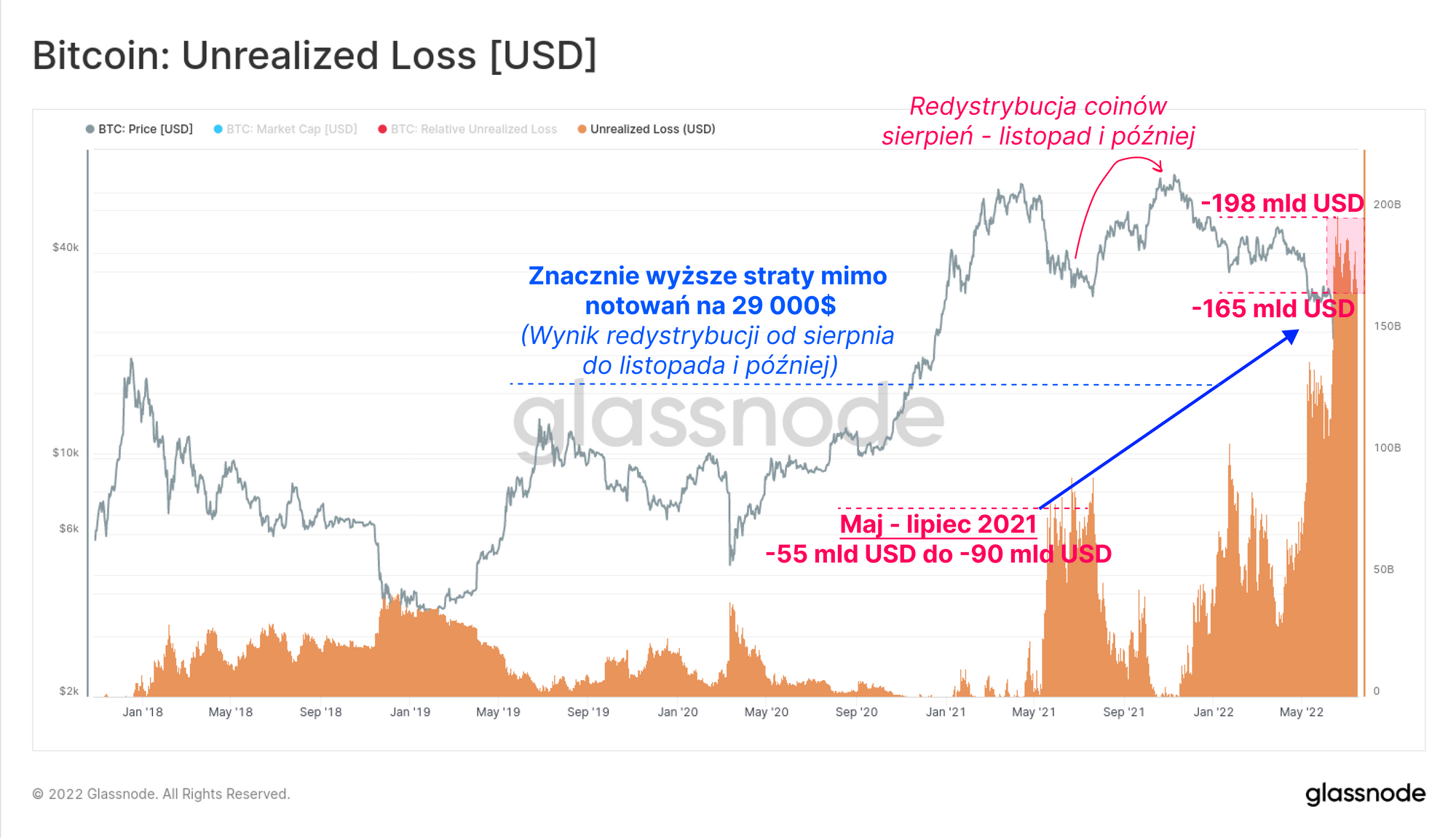 W maju oraz czerwcu 2022 roku miały miejsce dwa takie wydarzenia, zarówno podczas upadku LUNY, jak i po spadkach cen 18 czerwca poniżej ATH z 2017 roku. W ujęciu 30-dniowym, wydarzenia te spowodowały odpowiednio realizację strat w wysokości 27,77 mld USD oraz 35,5 mld USD. Jak pokazano poniżej, przyćmiewają one wszystko, co do tej pory widzieliśmy w przeliczeniu na USD.