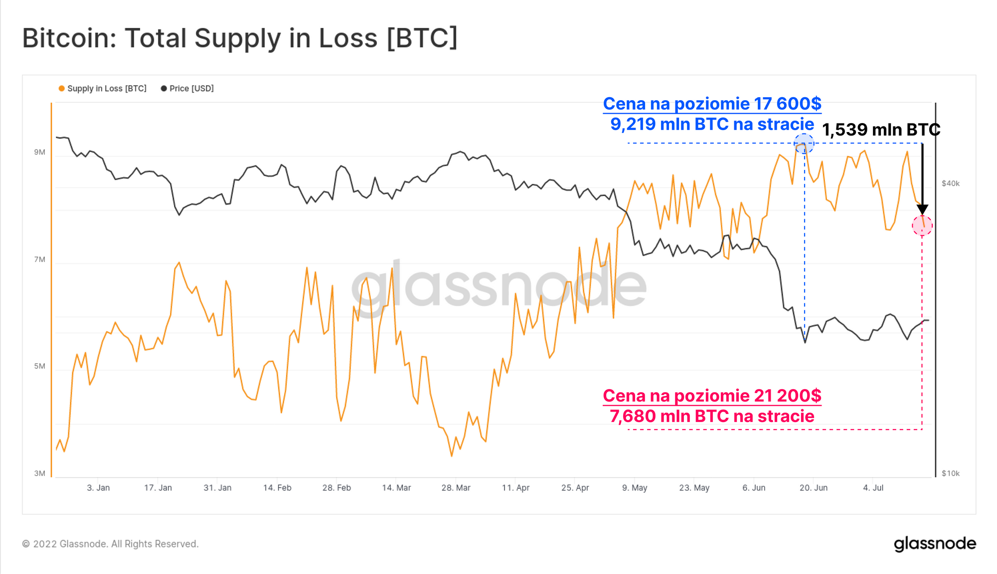 Sprawdzenie całkowitej podaży BTC będącej w zysku może wzmocnić powyższy argument. Gdy ceny spadły do 17 600$, łączny wolumen 9,216 mln BTC znajdował się na niezrealizowanej stracie. Jednak po kapitulacji z 18 czerwca, miesiącu konsolidacji i wzroście cen 21 200$, wolumen ten spadł do 7,68 mln BTC.