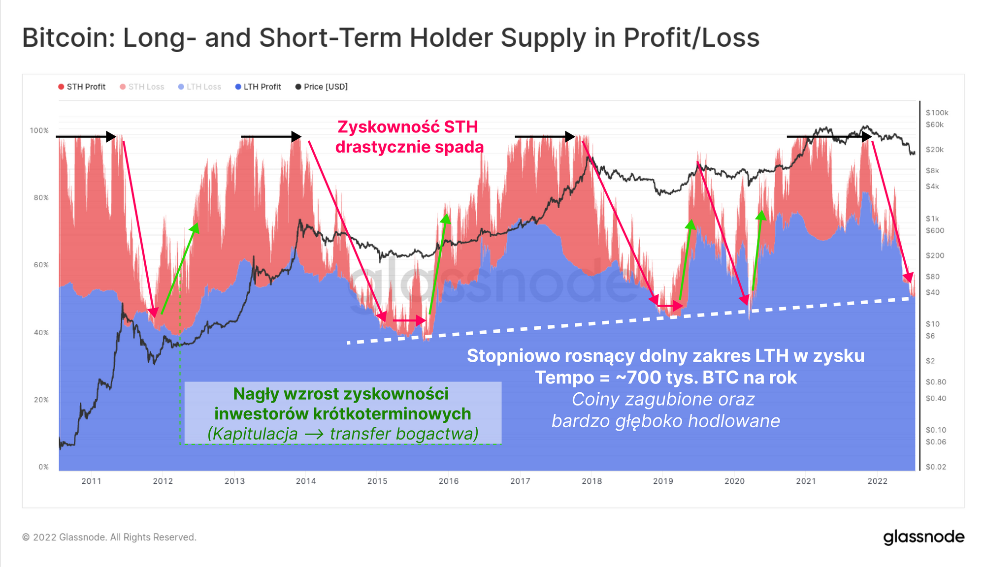 Możemy także sprawdzić coiny będące na niezrealizowanym zysku, tym razem przez pryzmat inwestorów długo- i krótkoterminowych. Widzimy tutaj, że wszystkie poprzednie dołki bess osiągały punkt, w którym praktycznie nie było żadnych inwestorów krótkoterminowych w zysku, co wynikało ze spadków cen znacznie poniżej ich poziomów nabycia.