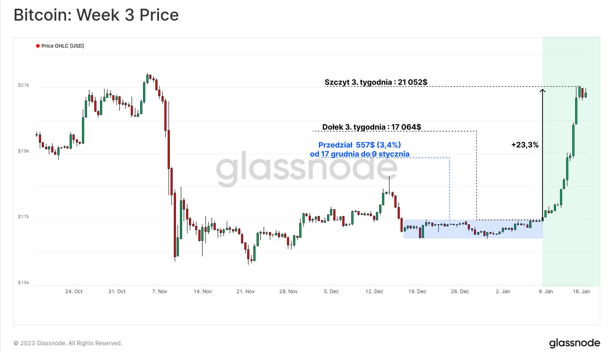 Po jednym z najmniej zmiennych okresów w historii Bitcoina (więcej o tym w newsletterze z 2. tygodnia), w tym tygodniu rynek odnotował niezwykły i wybuchowy wzrost o 23,3%. Notowania BTC wzrosły z tygodniowego dołka na poziomie 17 000$ do ponad 21 000$, przełamując kilka powszechnie obserwowanych technicznych i cenowych modeli on-chain. Wiele z tych modeli ma tendencję do działania jako znaczące poziomy oporu psychologicznego podczas bessy, co sprawia, że ich przebicie jest godne uwagi.