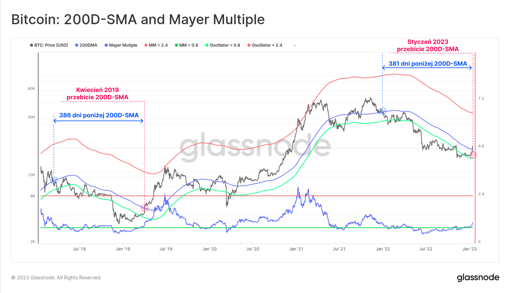 Dzięki potężnym wzrostom w ubiegłym tygodniu rynek pokonał ten psychologiczny poziom 19 500$. Rynek Bitcoina często wykazuje dziwnie spójne zachowanie cykliczne, a w tym cyklu notowania znajdowały się poniżej 200D-SMA przez 381 dni, czyli zaledwie 5 dni mniej niż podczas bessy 2018-19 (386 dni).