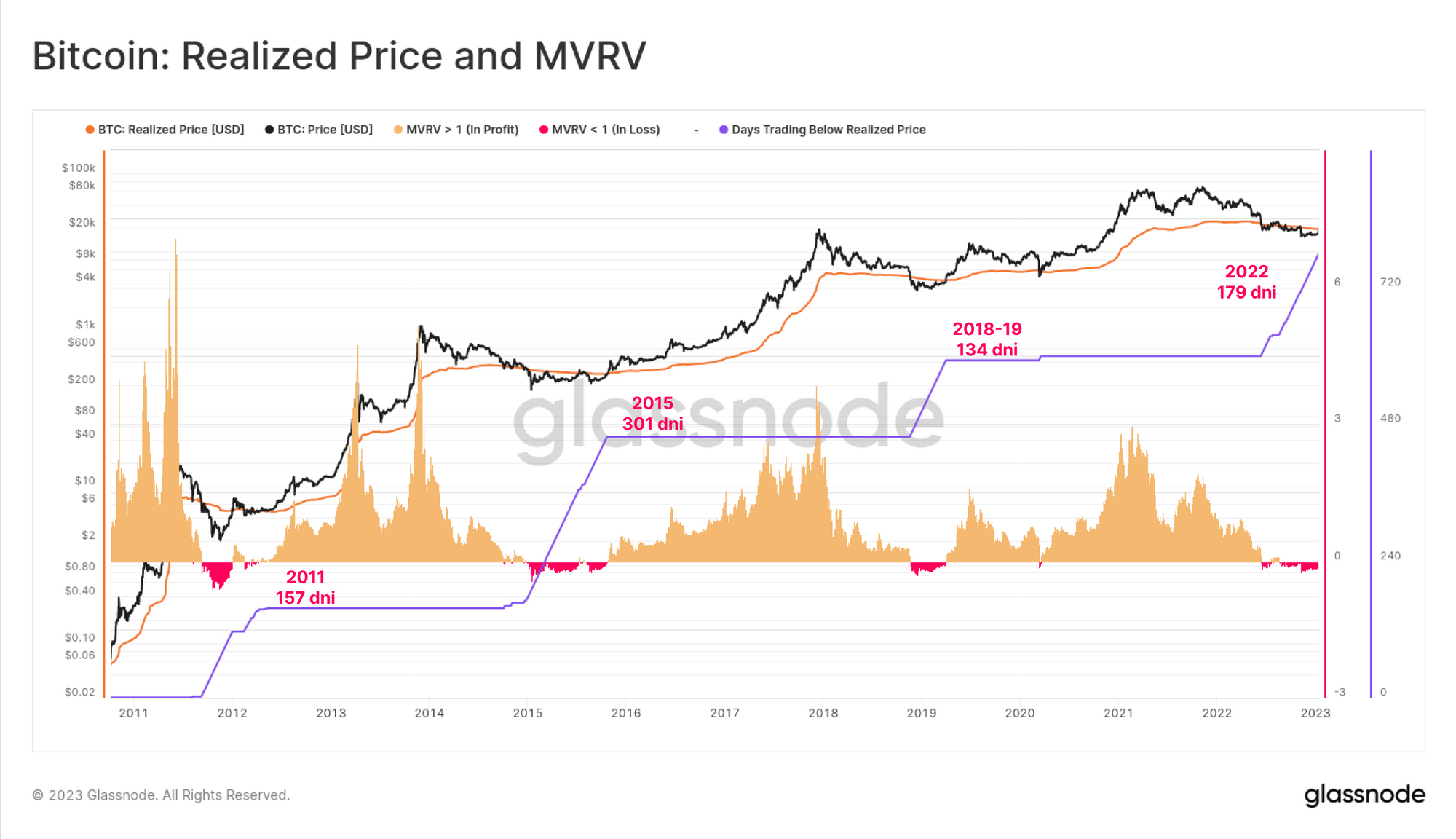 Do tej pory bessa 2022-23 odnotowała 179 dni poniżej Realized Price, co czyni ją drugim najdłuższym okresem poniżej tego poziomu w ciągu ostatnich czterech rynków niedźwiedzia.