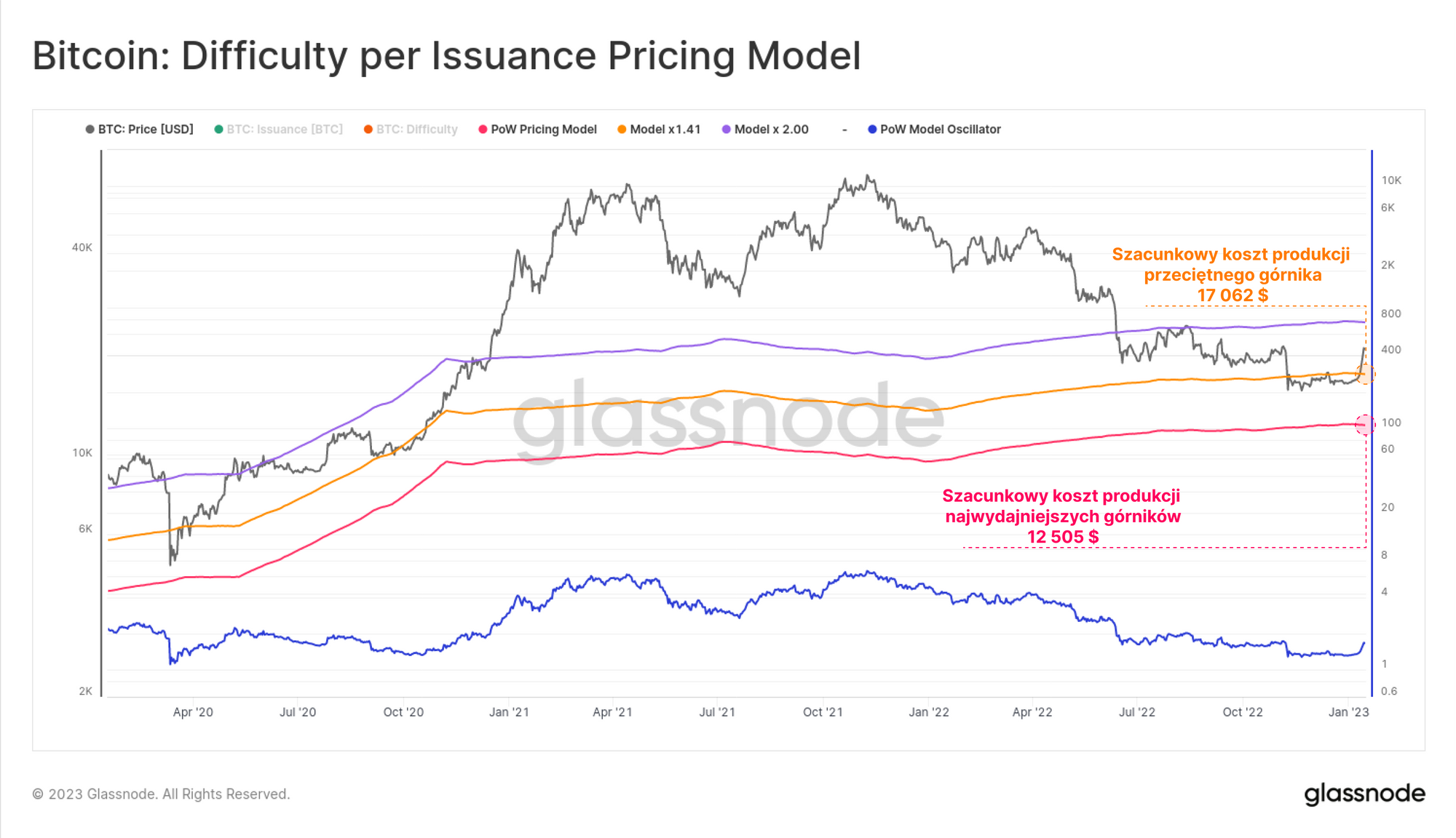 Poniższy model szacuje średni koszt produkcji BTC na 18 798$, przy założeniu, że poziom trudności odzwierciedla ostateczny „koszt” sektora wydobywczego.