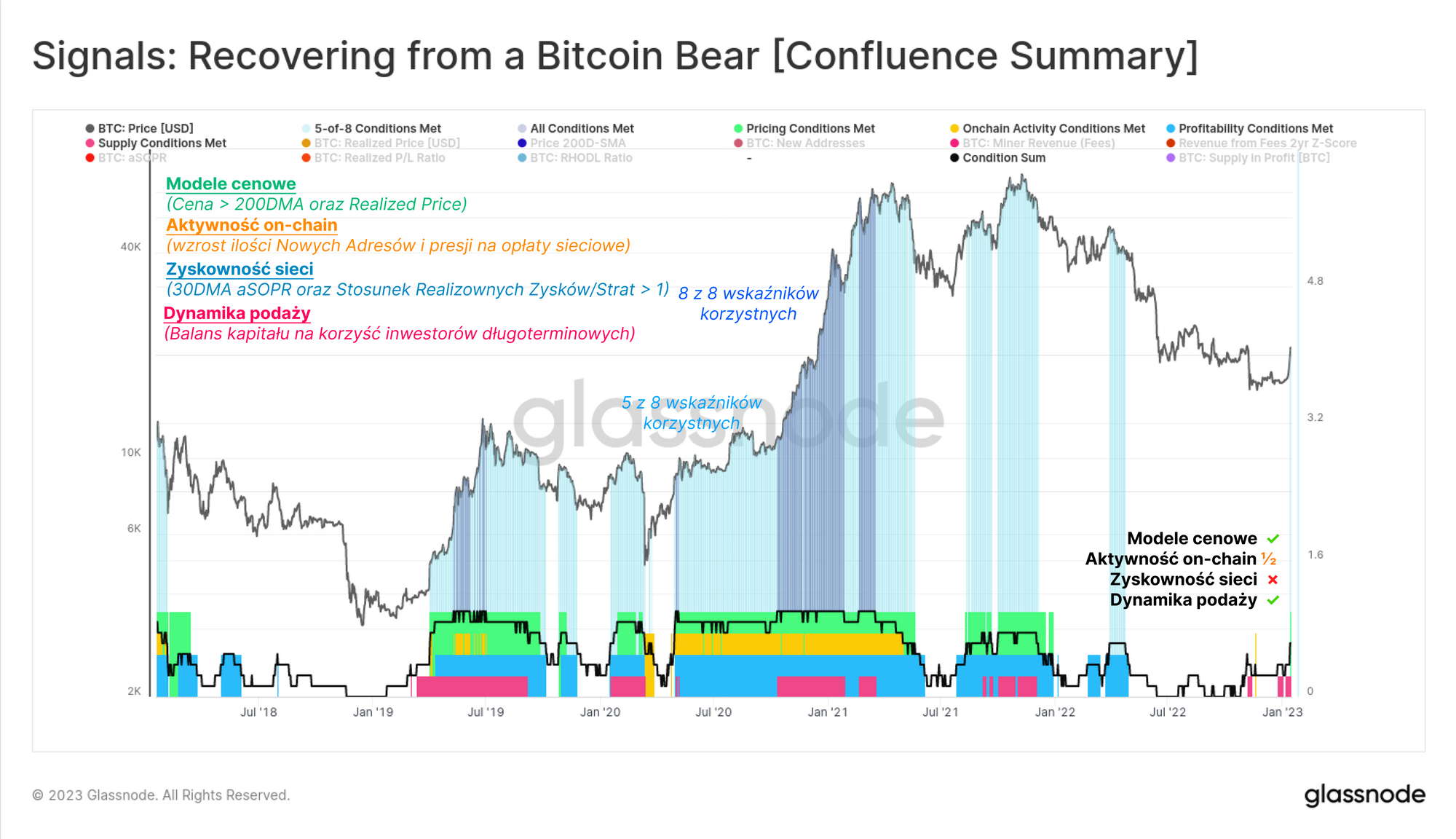 Zbliżając się ku końcowi chcielibyśmy poinformować, iż niedawno wydaliśmy nowy design Pulpitu zawierającego wskaźniki mające na celu znalezienie zbieżności między kilkoma wskaźnikami on-chain, w ramach czterech podstawowych koncepcji. Ten model wyłapuje kluczowe poziomy i obserwacje, które w przeszłości sygnalizowały, że trwa solidne ożywienie z odmętów bessy i przedstawia je w formie łatwego do nawigacji, wizualnego narzędzia.