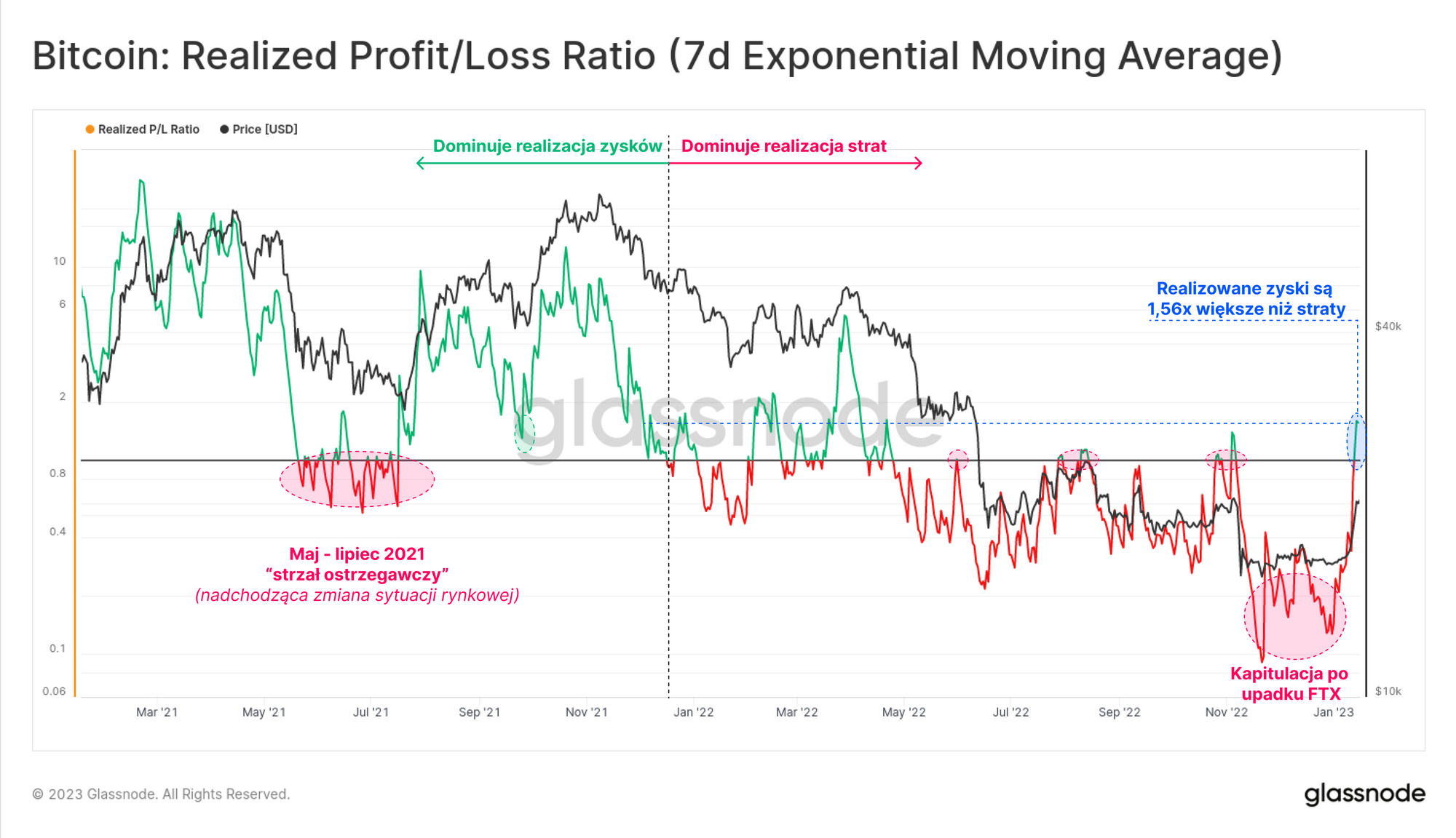 Tuż nad 200D-SMA znajdował się poziom Realized Price - 19 700$. W świecie Bitcoina ten psychologiczny model kosztu bazowego jest również powszechnie obserwowany. Ponieważ notowania znajdują się obecnie znacznie powyżej tego modelu cenowego, wskazuje to, że przeciętny posiadacz BTC powrócił do niezrealizowanego zysku netto.